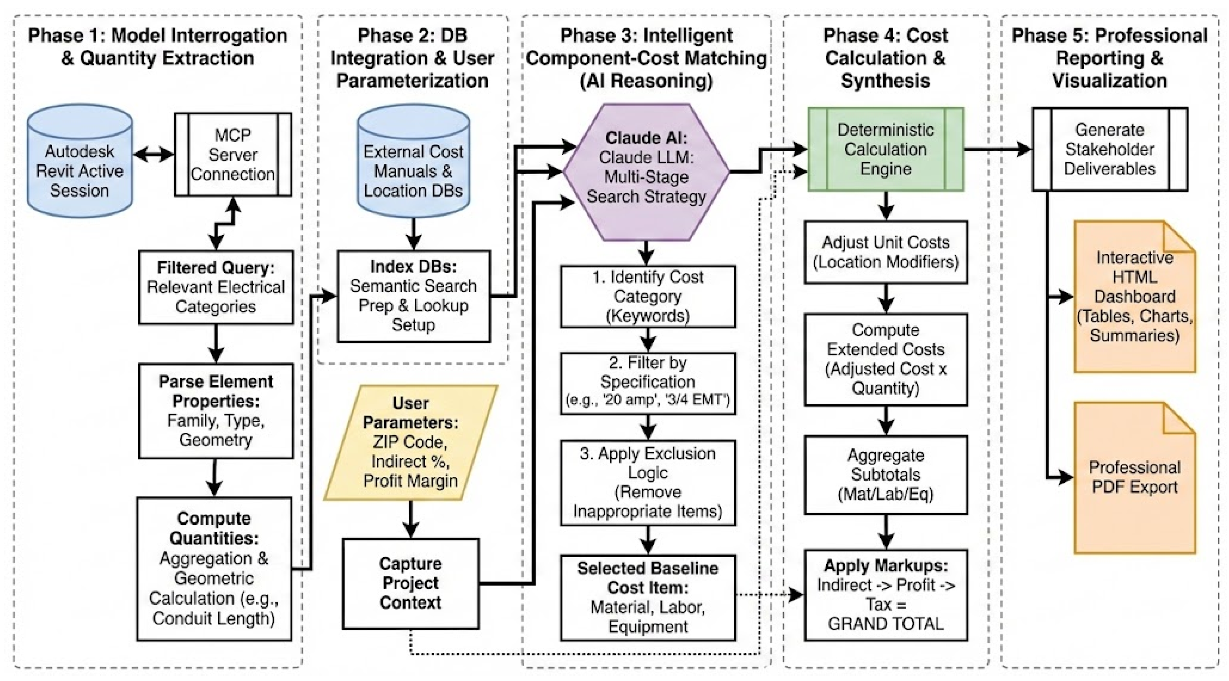 - Performance Validation: Quantitatively validate the system’s performance by measuring accuracy (cost variance from manual estimates) and efficiency (time reduction) against manual professional processes, establishing precise performance benchmarks.
