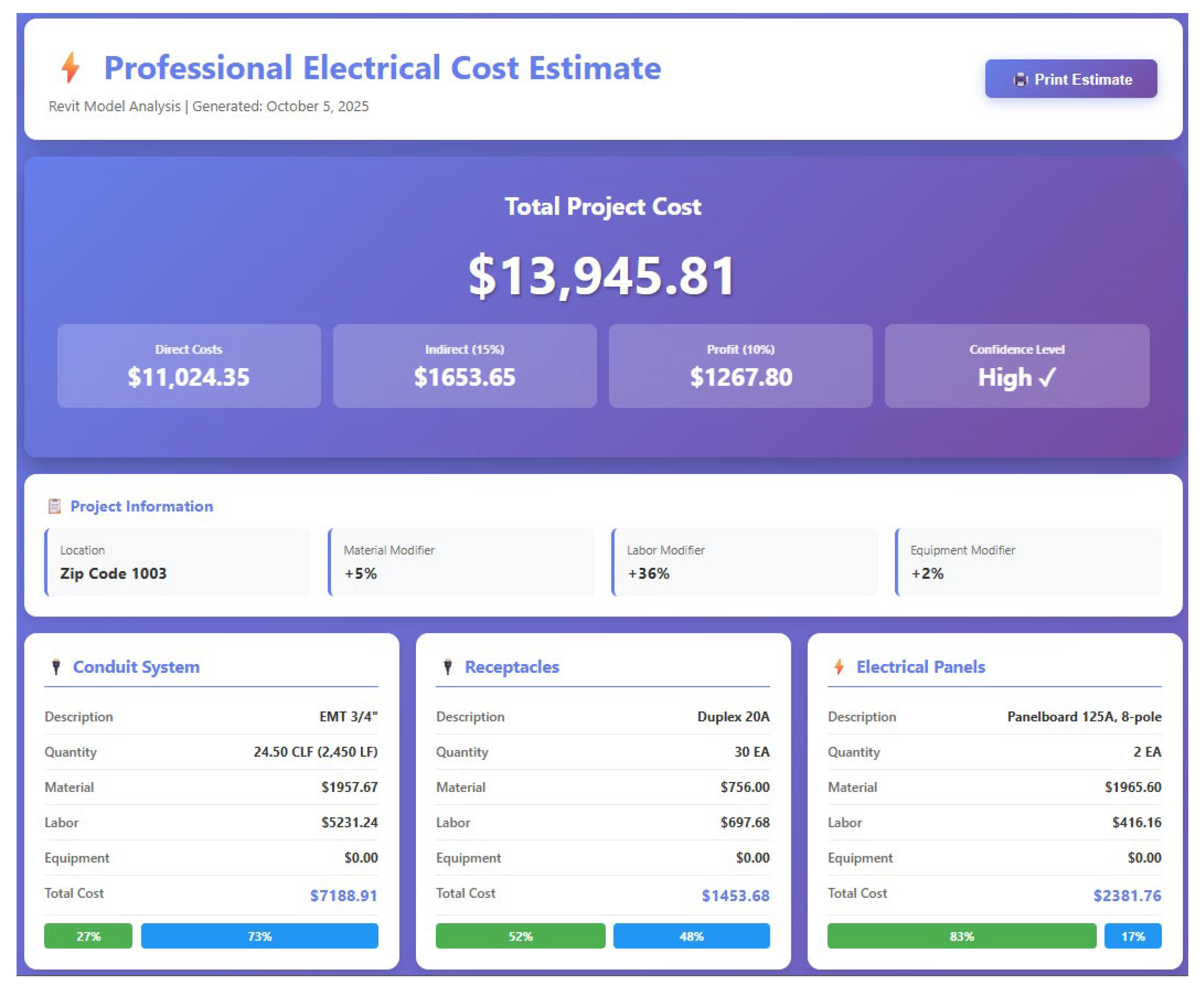 | Project Parameters | User-defined inputs | ZIP: 01003; Indirect: 15%; Profit: 10% |