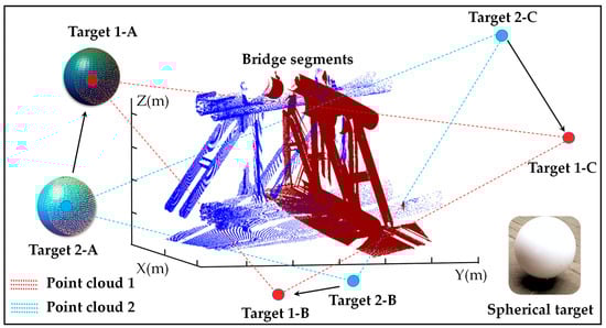 In target-based registration, stable, high-quality point clouds are acquired by exploiting the geometric or radiometric attributes of the targets, and the coordinates of feature points on the targets are computed from their feature relations. With the spherical target taken as an example, registration is performed by fitting a sphere to the target point cloud, from which the center coordinates are obtained. The fitted sphere centers in the target point cloud (PC1) and the source point cloud (PC2) are used as corresponding points to solve a rigid-body transformation, implemented via a spatial similarity transformation. The procedure is illustrated in Figure 1.