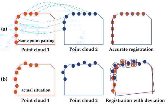 Schematic illustration of ICP registration error. (a) Ideal point cloud registration; (b) Actual point cloud registration.