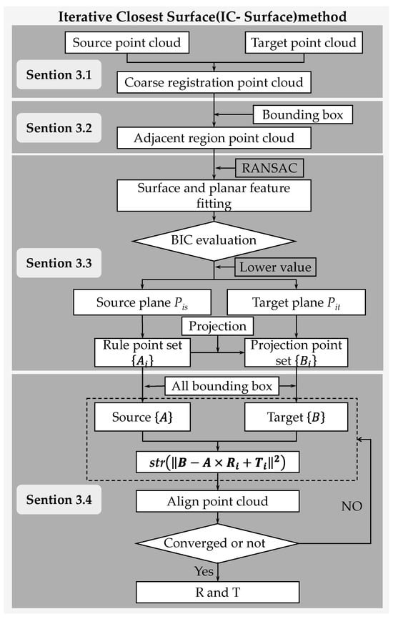 On the basis of the preceding analysis, the IC-Surface method is proposed as a high-precision registration algorithm for point clouds of long-span bridges. As a feature-based, data-driven registration approach, it reduces the burden of field scanning compared with target-based registration. In addition, a bounding box is used to extract the bridge point clouds; surface patches on the structure are fitted, and correspondences are constructed for registration. The intent is to match point clouds via surface patch features, thereby avoiding—at the principle level—the loss of accuracy in ICP caused by the absence of truly identical correspondences in practical scans. A flowchart of the proposed method is shown in Figure 4. The IC-Surface registration procedure is summarized in Algorithm 1.