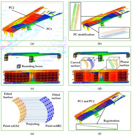 Steps of the proposed IC-Surface point cloud registration: (a) initial point cloud; (b) coarsely registered point clouds; (c) segmenting point clouds with bounding boxes of a specified size; (d) filtering boxes by selection criteria and fitting planes to the in-box points; (e) generating regular points on the fitted planes; (f) registered point clouds.