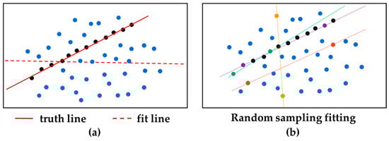 Subsequently, the feature parameters are estimated. Sparse point clouds of long-span bridges typically contain noise and outliers, which is why these effects must be excluded during surface fitting. In traditional approaches, least-squares fitting is commonly used; however, the estimates can deviate substantially from the ground truth, as illustrated by the sample in Figure 6a, because least squares lacks a mechanism to reject noise and outliers. RANSAC [44] is employed to address this issue. Its main idea is to draw random subsets from the full sample, as shown in Figure 6b. Over repeated trials, estimates computed from inlier subsets remain consistent with the ground truth, whereas estimates from subsets dominated by outliers vary randomly.