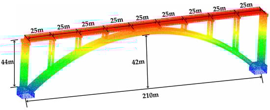 The performance of the proposed method was compared with that of four registration methods: classical ICP [35], point-to-plane ICP (ICP-P) [49], fast ICP [50], and sparse ICP [42]. In this section, a 3D digital model of a deck-type arch bridge with a span of 210 m and a rise of 42 m was built in a building information modeling (BIM) environment to generate synthetic point cloud data. The model is converted into a point cloud using curvature-based sampling [47], generating a synthetic bridge point cloud with a total of 1 million points, as shown in Figure 7. To evaluate the impact of different overlap ratios on the registration accuracy of the proposed method, the synthesized point cloud data are partitioned into segments along the bridge longitudinal direction. The first 70% of the synthesized point cloud data is used as the target point cloud, and the last 80%, 70%, and 60% are used as the source point cloud to construct point cloud pairs with different overlap ratios. At the same time, the point cloud registration performance of the method under different degrees of outliers was verified by adding Gaussian noise with mean and standard deviation to the synthesized point cloud data as outliers. For a more accurate assessment of the proposed algorithm, bounding boxes with a side length of 1 m were defined on the registered point clouds, and 20 boxes containing planar features were randomly selected. Transformed point cloud (PC1) and target point cloud (PC2) are respectively fitted in a single bounding box, and the unit normal and of the plane are solved. The average angle between the normals of and within m bounding boxes is taken as the angle error . The average difference of the Euclidean distance between the artificial point cloud on and the projected point cloud point pairs on inside m bounding boxes is computed. The performance of the proposed algorithm is evaluated by comparing the proposed method with that of the classical ICP, ICP-P, fast ICP, and sparse ICP algorithms in terms of angle error , distance error , and running time T. Table 1 summarizes the detailed parameter settings for each comparative algorithm in this experiment. and are calculated according to Equations (10) and (11).