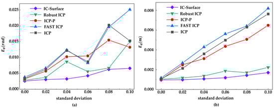 Figure 8 shows the comparison of point cloud registration errors between several algorithms with different standard deviations of Gaussian noise added. The robustness of the proposed algorithm to outliers is evaluated by adding noise with different standard deviations to simulate different degrees of outliers. Overall, both and increase with the increase in Gaussian noise standard deviation. Fast ICP, ICP, and ICP-P are more sensitive to Gaussian noise levels than robust ICP and IC-Surface. As the standard deviation of noise increases, the registration error increases sharply. The main reason is that the fast ICP, ICP, and ICP-P algorithms have no strategy for handling outliers. When the standard deviation of Gaussian noise is 0.1, IC-Surface shows good performance with = 0.004 red and = 0.008 m. The error of robust ICP in is similar to that of the proposed method, while the error in increases significantly, reaching 0.014 rad. The reason for this result is that its outlier rejection strategy has difficulty effectively eliminating the influence of outliers in high-outlier situations. Fortunately, in the process of bounding box plane fitting using the proposed method, both plane fitting and artificial point cloud methods were used, effectively reducing the impact of outliers on the accuracy of point cloud registration. Therefore, the proposed method has good robustness against outliers.