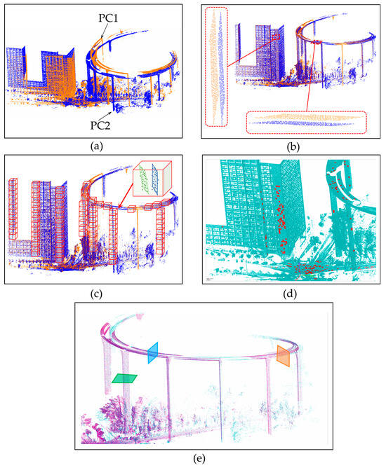IC-Surface registration at the Sujiaba Interchange: (a) initial point clouds; (b) coarsely registered point clouds; (c) bounding box layout; (d) selected surface point clouds; (e) registered point clouds.