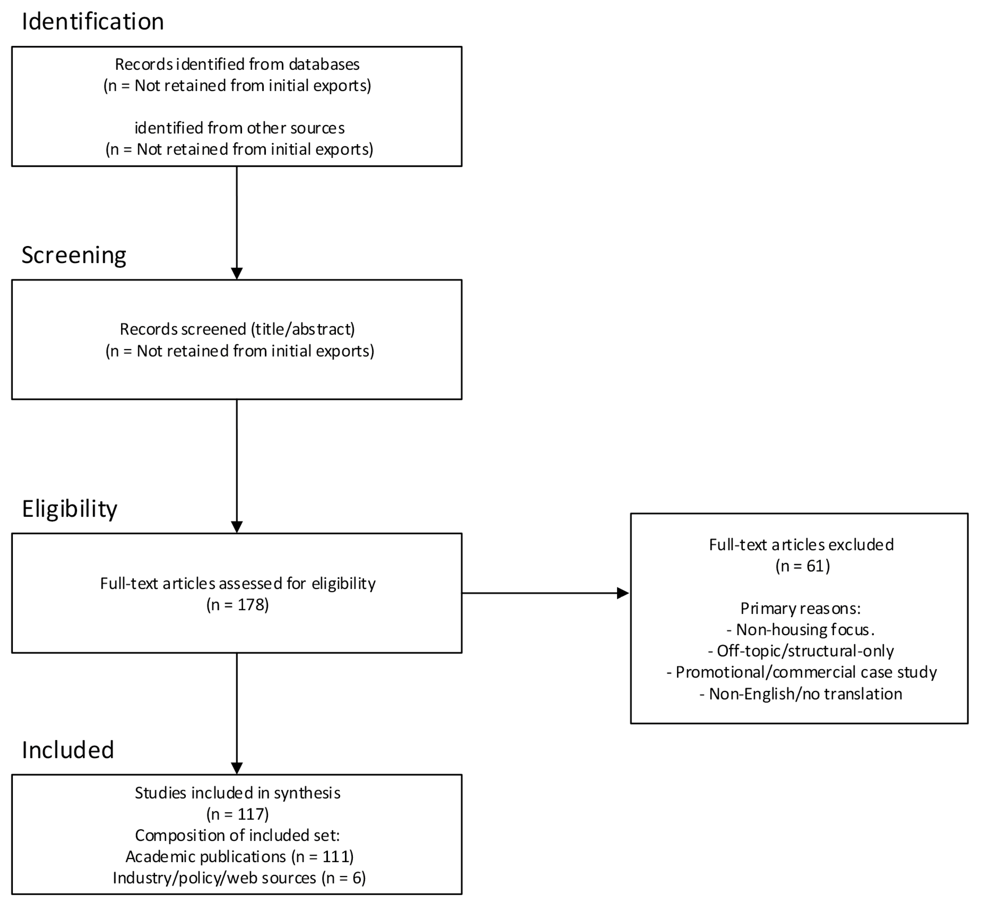 APA StyleHedayati, D., Amirmijani, M., Zabeti Targhi, S., Latifiilkhechi, L., & Sharafi, P. (2026). Industrialised Housing Delivery: A Systematic Literature Review and Thematic Synthesis of Uptake, Digital Integration, and P-DfMA Drivers. Buildings, 16(3), 552. https://doi.org/10.3390/buildings16030552