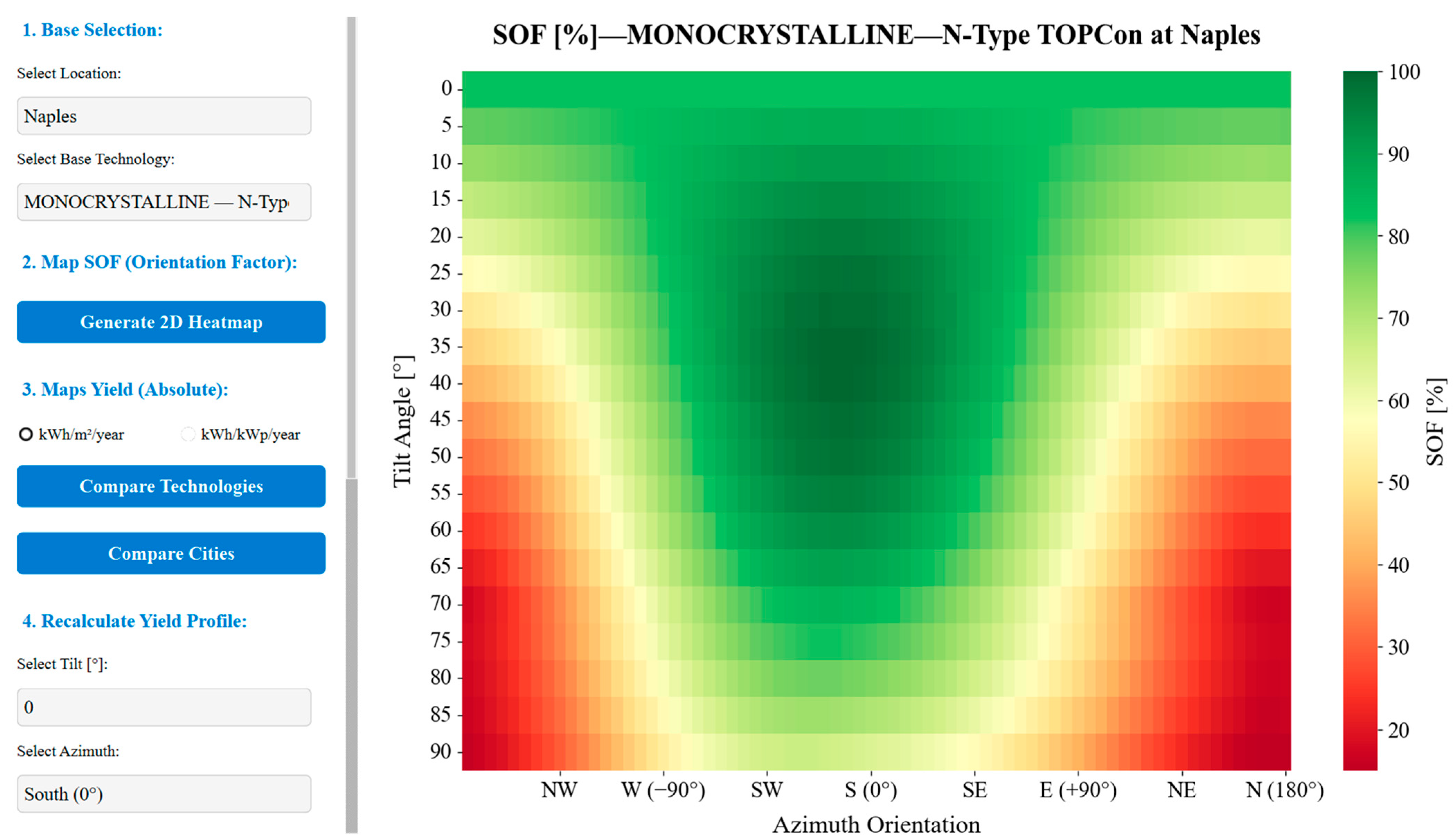 - represents the maximum specific yield found within the simulation grid for the selected city and technology.