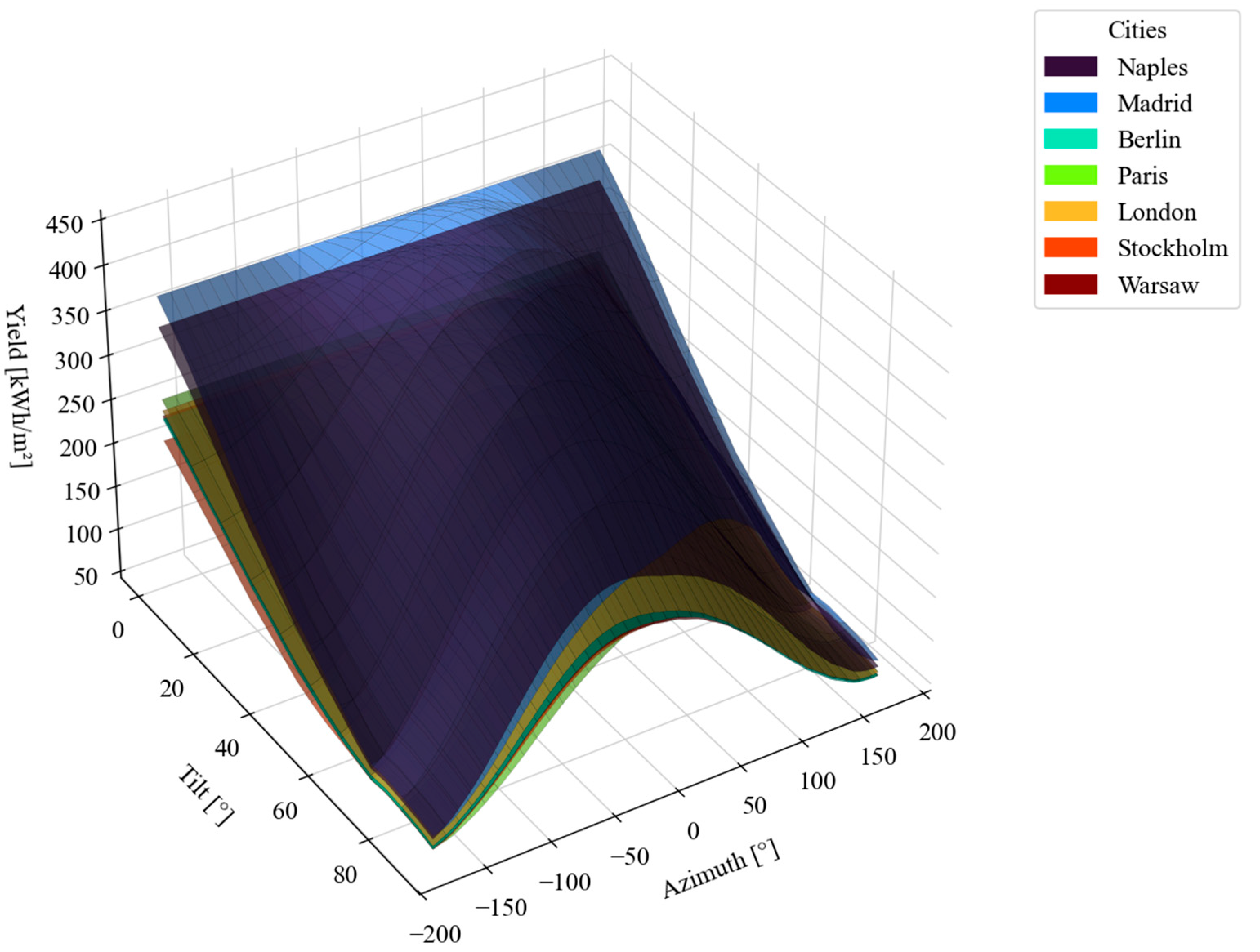 | City | Opt. Tilt (°) | Opt. Azimuth (°) | (kWh/kWp) | Tilt ± 15° Δ | Tilt ± 30° Δ | Azimuth ± 15° Δ | Azimuth ± 30° Δ |