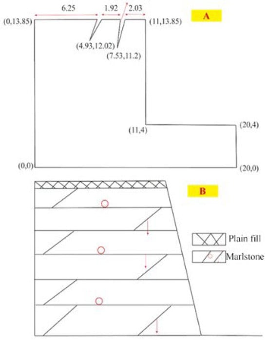 Schematic diagram of the slope model. (A) Plan and (B) section.