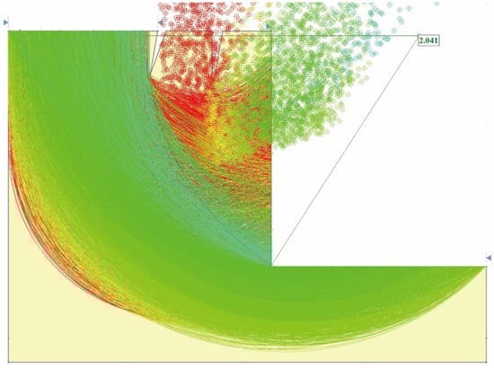 The potential sliding surface and stability safety factor of the slope in its natural state, without rainfall, are shown in Figure 9, with a safety factor of 2.041.