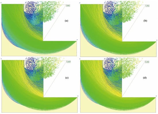 The potential sliding surfaces and safety factors under different seismic accelerations are shown in Figure 11. When a = 0.05 g (i.e., magnitude 6 earthquake), the safety factor of the slope was 1.761. At a = 0.1 g (i.e., magnitude 7 earthquake), the safety factor of the slope was 1.704. When a = 0.2 g (i.e., magnitude 8 earthquake), the safety factor of the slope dropped to 1.137. At a = 0.4 g (i.e., magnitude 9 earthquake), the safety factor of the slope further decreased to 0.903. From these data, it can be seen that as the magnitude of the quake increases, the stability safety factor of the slope gradually decreases. Moreover, when the earthquake magnitude reaches magnitude 8, the slope is in a less stable state, and during a magnitude 9 earthquake, the slope becomes unstable.