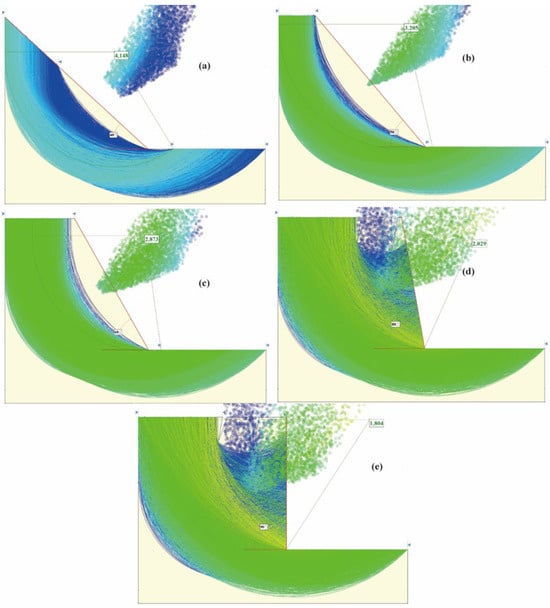 Potential sliding surfaces and stability safety factors of the slope under cutting conditions at (a) 40 degrees; (b) 50 degrees; (c) 60 degrees; (d) 80 degrees; and (e) 90 degrees.