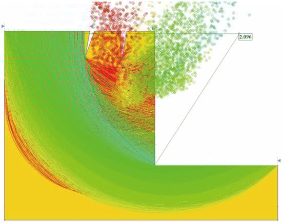 After vegetation restoration, the slope sliding surface and safety factor under natural conditions are shown in Figure 13 below, with a safety factor of 2.096.