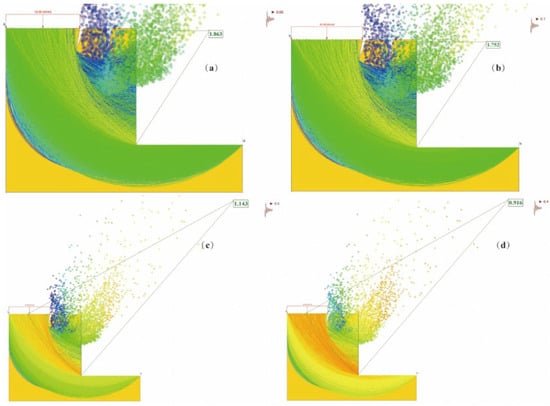 Potential sliding surface and stability safety factor of the slope under seismic conditions: (a) magnitude 6 earthquake, a = 0.05; (b) magnitude 7 earthquake, a = 0.1; (c) magnitude 8 earthquake, a = 0.2; (d) magnitude 9 earthquake, a = 0.4.