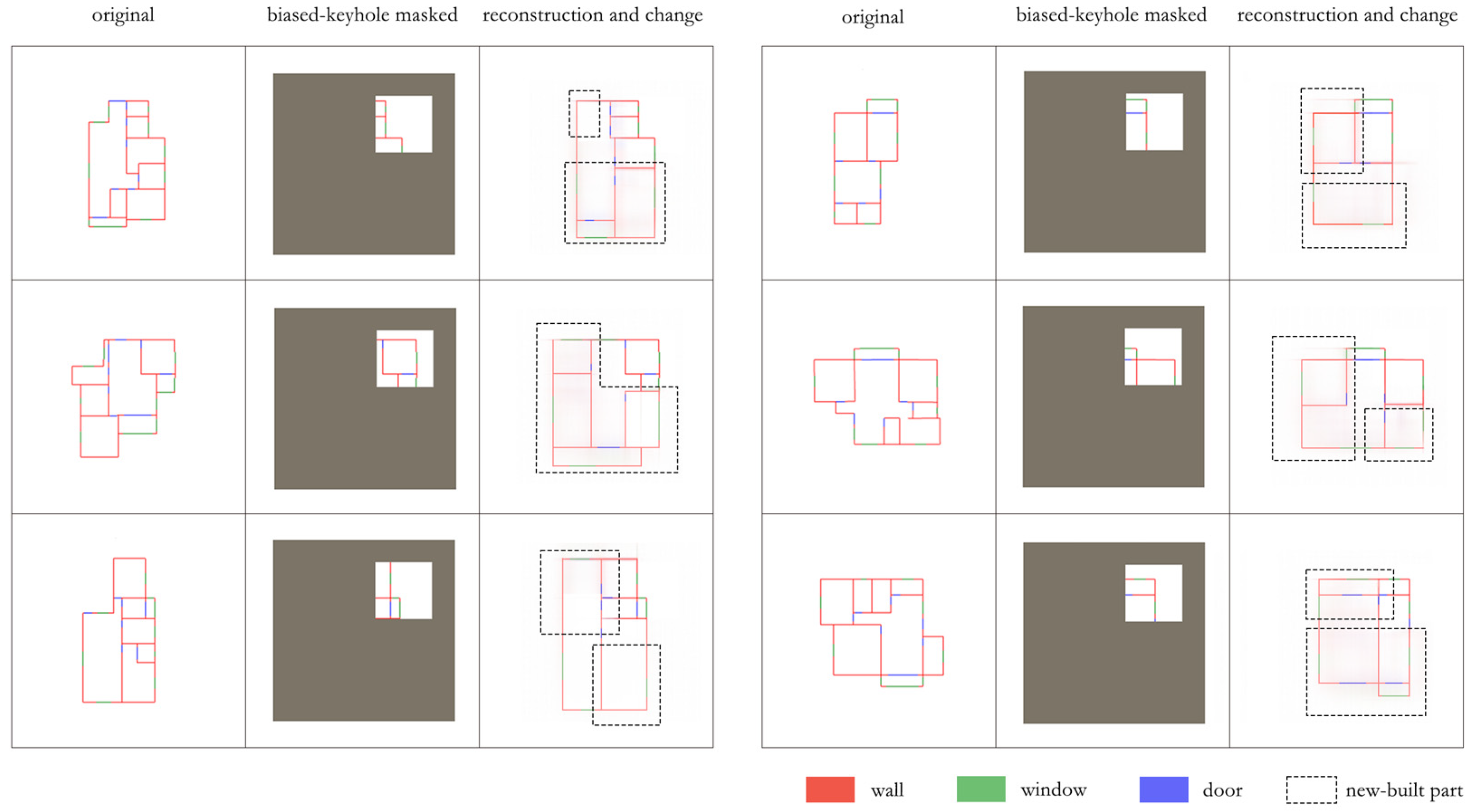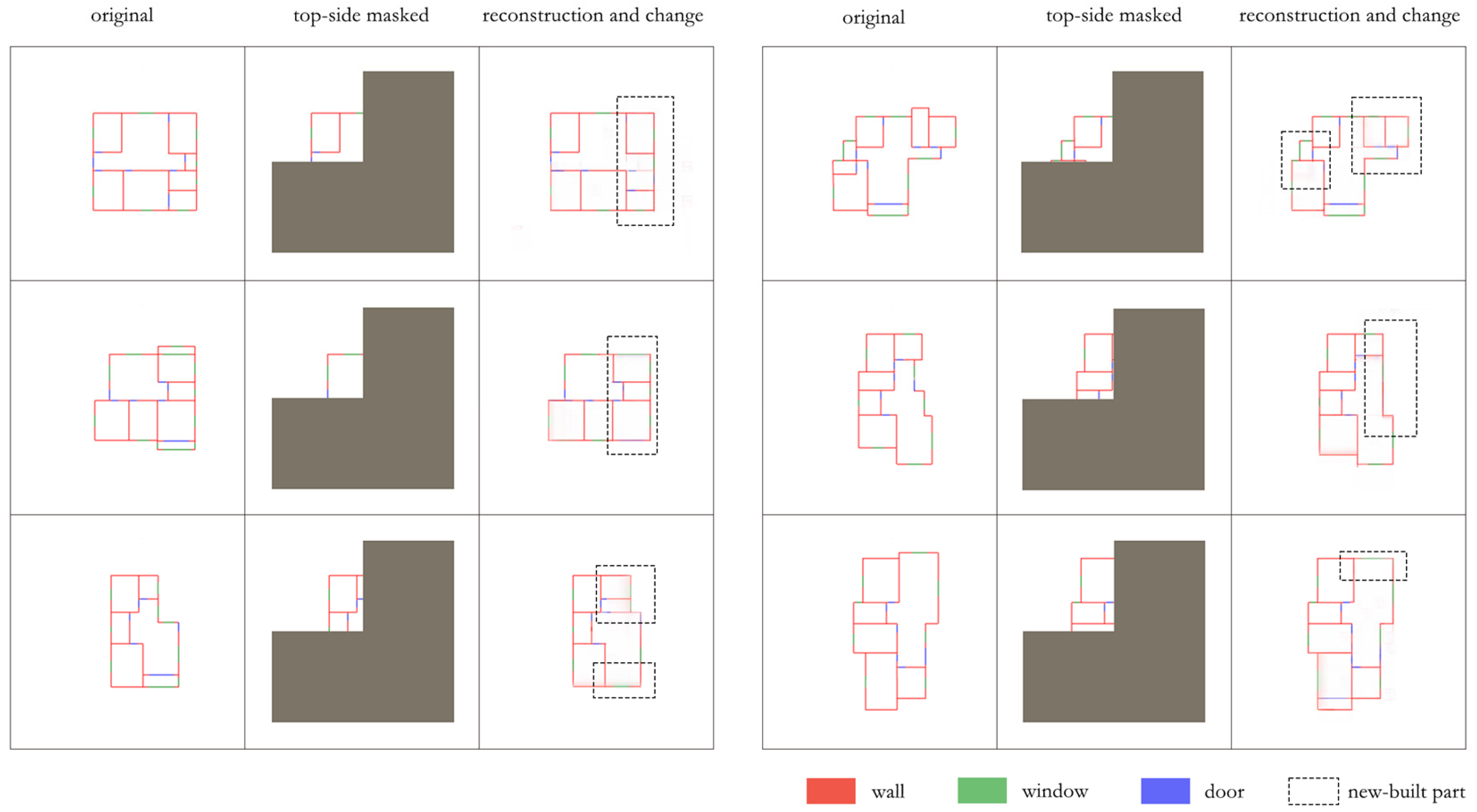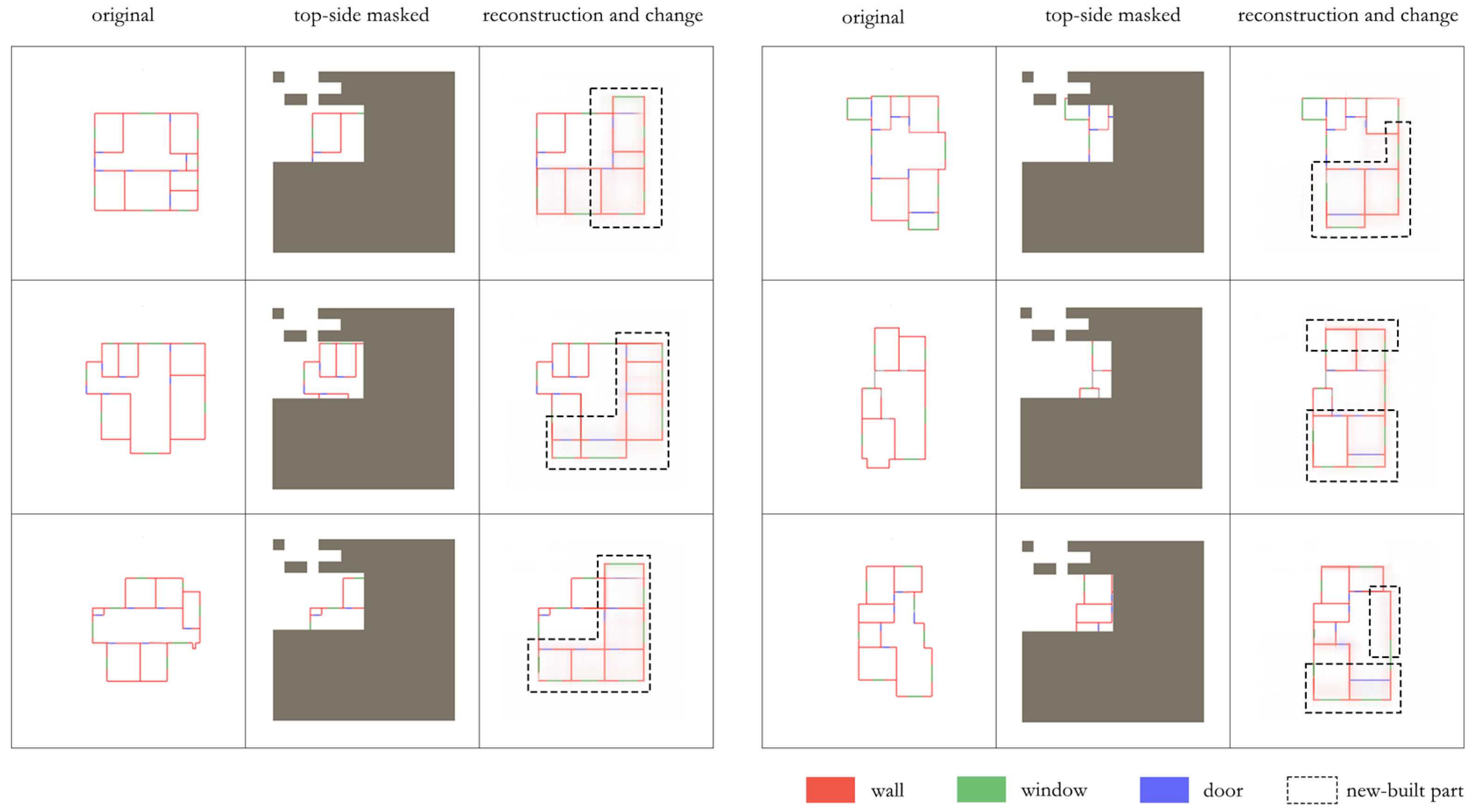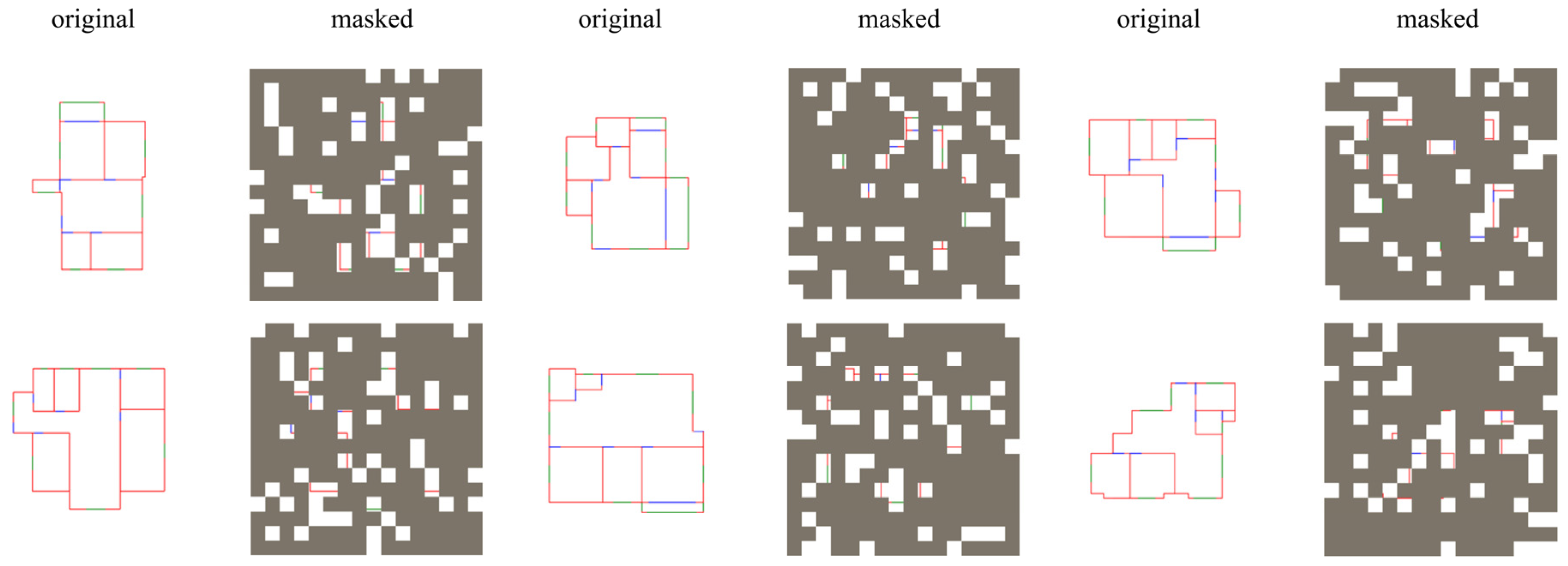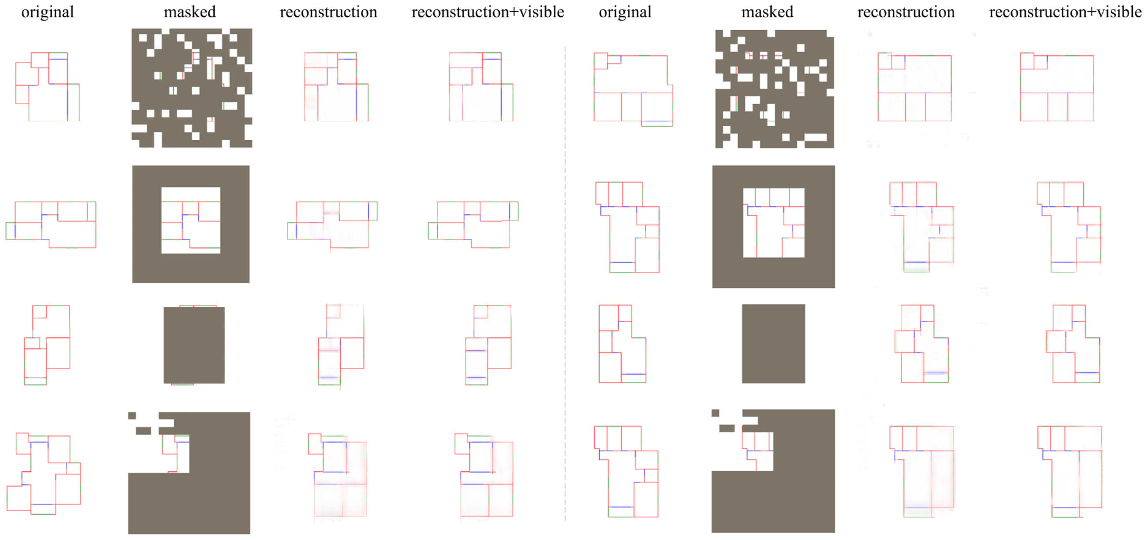 - We apply large-scale masking to provide the encoder with ample room to operate efficiently, using sparse input image patches to predict an entire architectural floor plan from limited information.