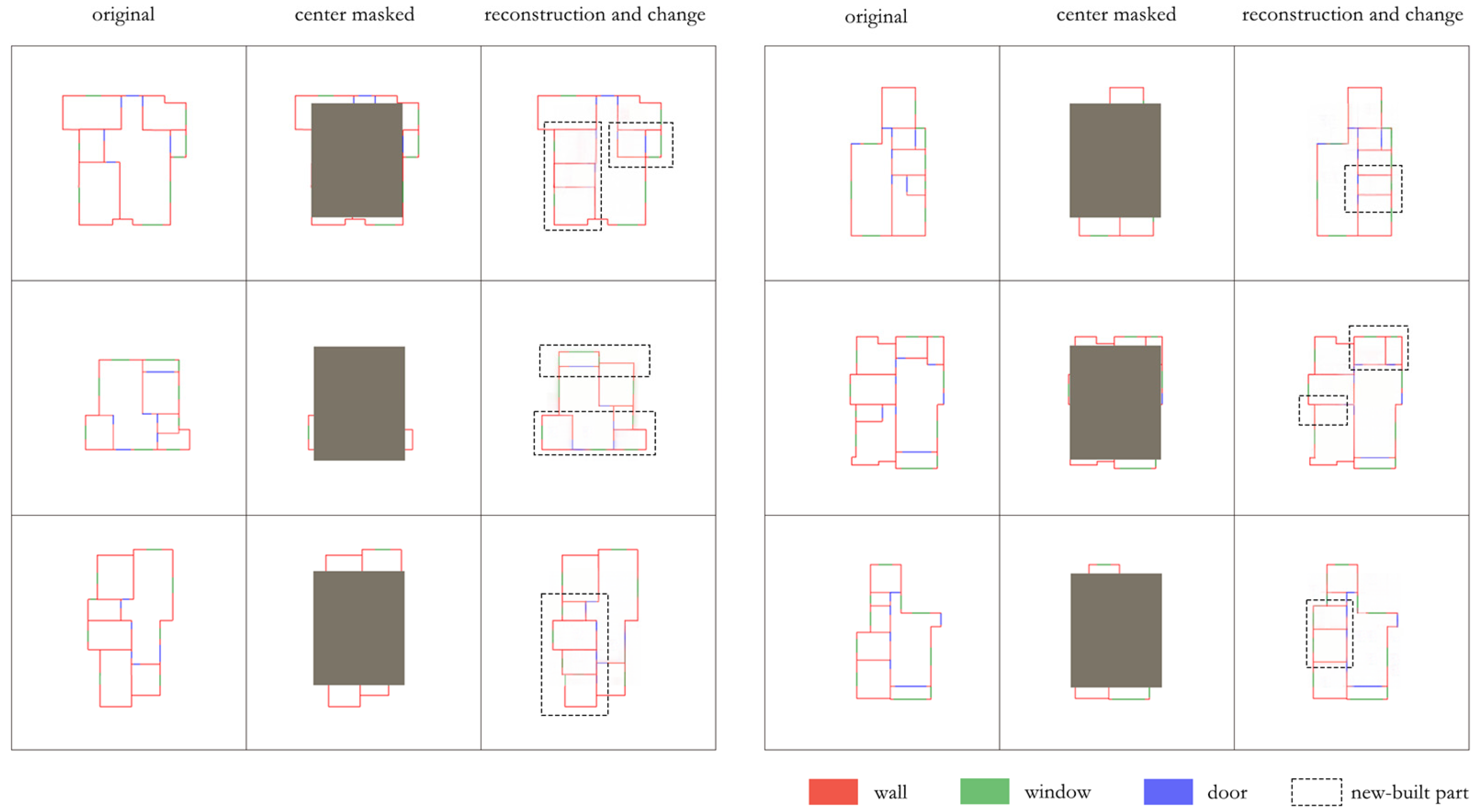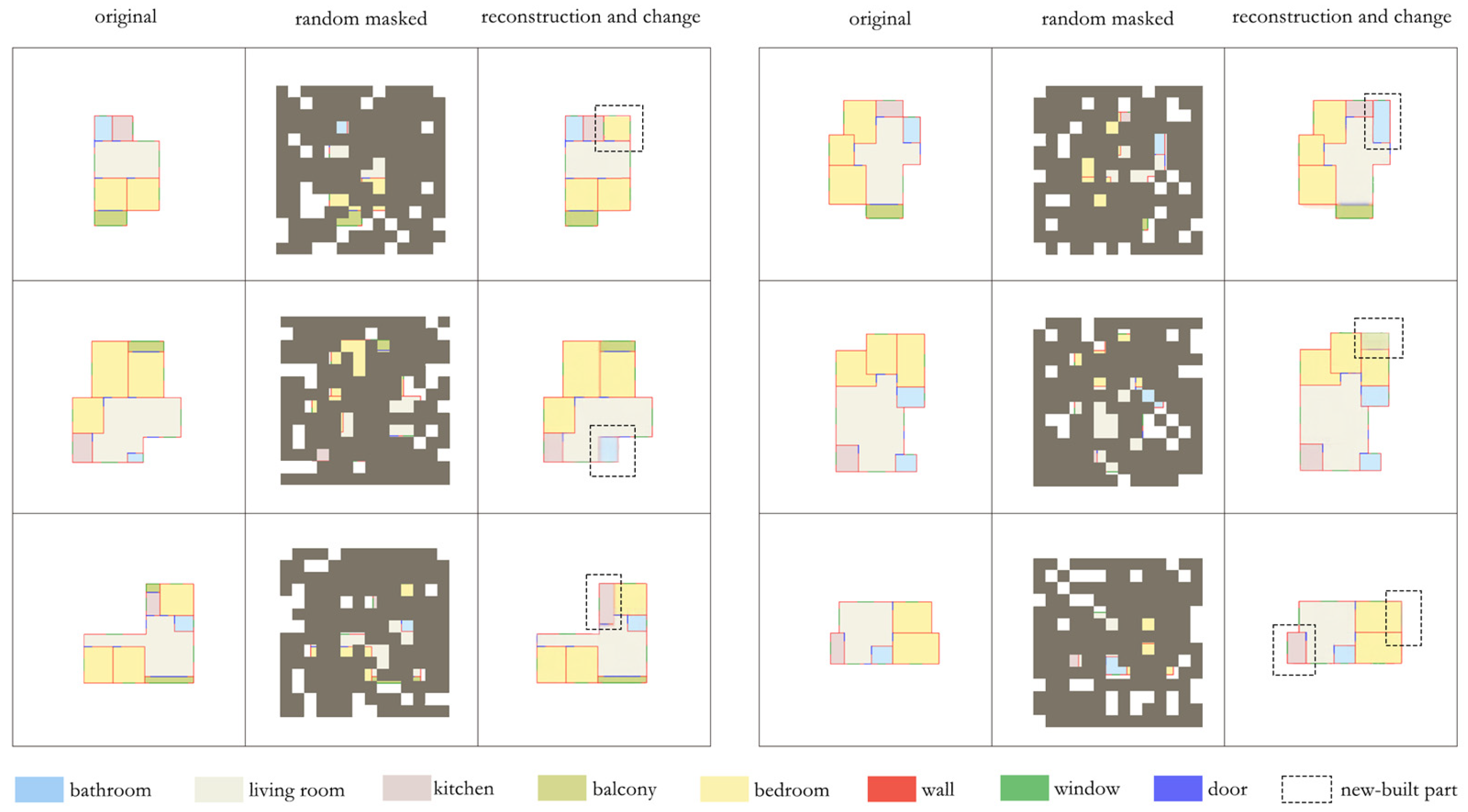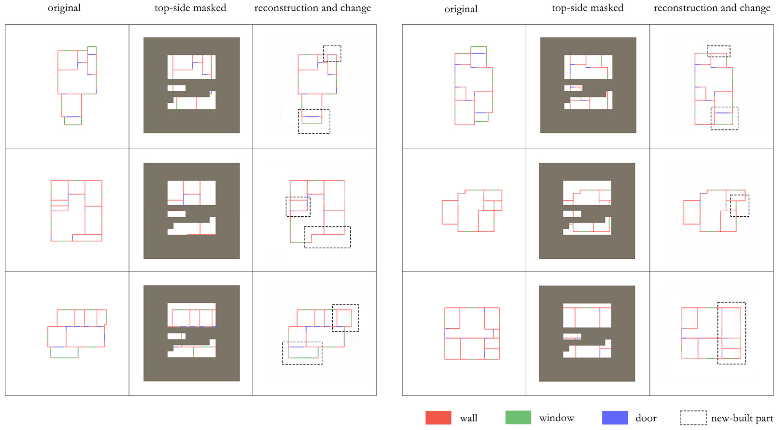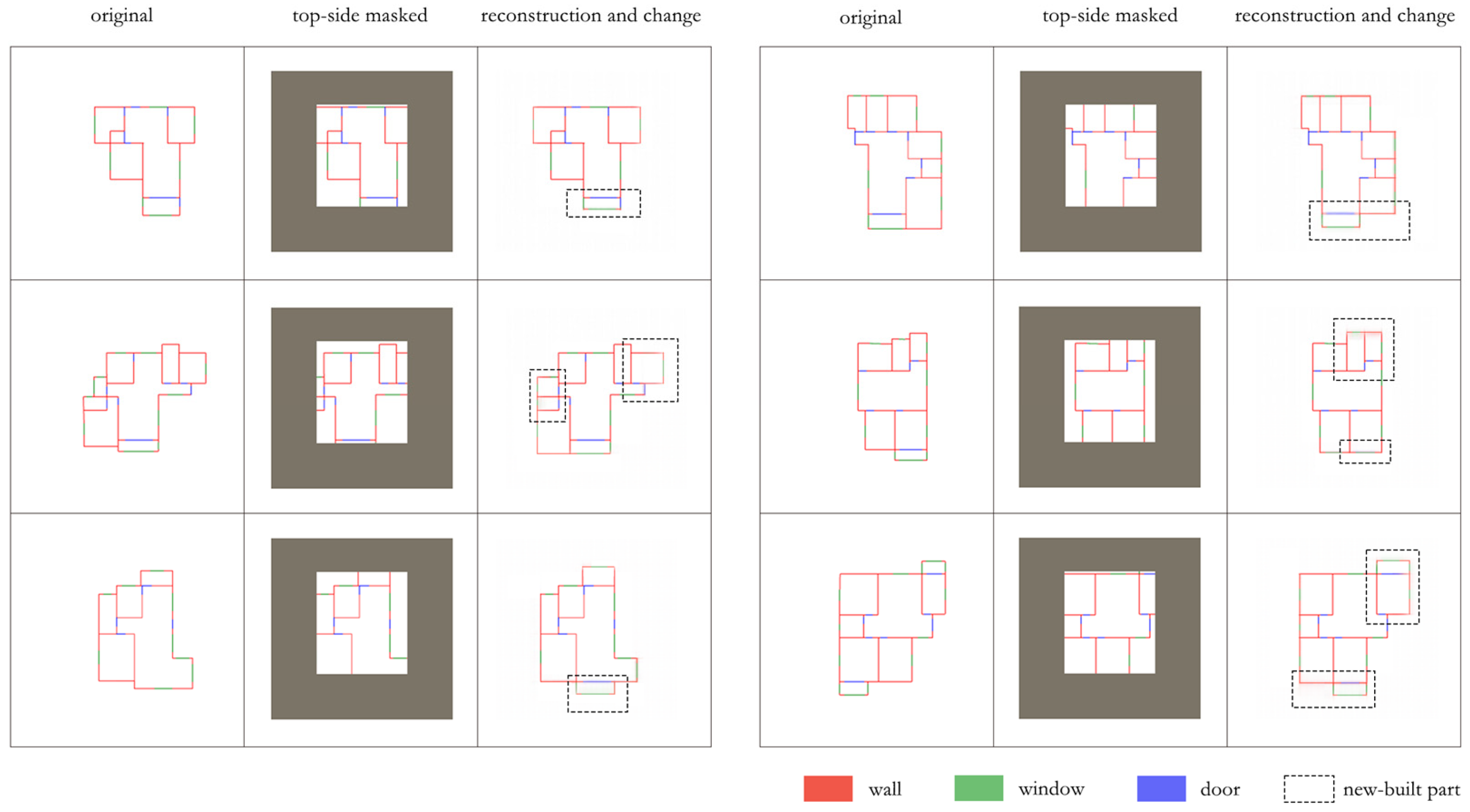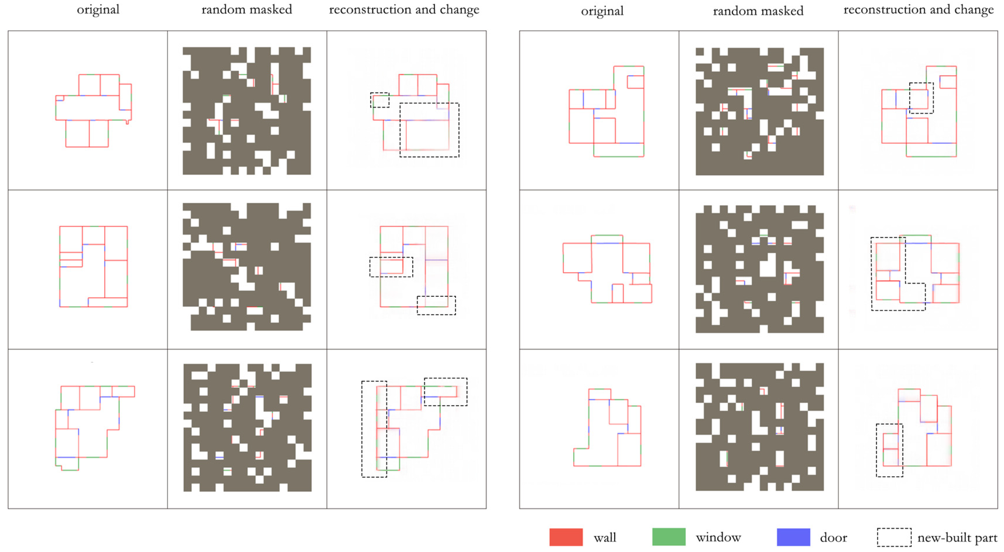 - Random Masking (80% masked): Figure 6 and Figure 7 show examples of FP-MAE reconstructions where the input patches were randomly masked (Figure 6 for a line-drawing plan, Figure 7 for a colored plan). Despite the extremely large amount of missing information, the model is still able to restore a reasonable architectural floor plan structure and make local adjustments that align with the visible content. In the line drawing case, the input might have only sparse wall segments and a few visible corners. FP-MAE completes the structure by drawing walls that enclose spaces, effectively guessing the presence of rooms. One can see that the primary functional zoning remains clear in the output. Some small details are understandably imperfect, for example, the exact positions of doors and windows in the reconstructed portion may not match the original and room dimensions might be slightly off, since multiple configurations could satisfy the limited cues. In the colored plan case, FP-MAE not only reconstructs the walls but also fills the correct color in many areas, indicating it inferred the room types. However, those differences do not detract from the overall feasibility of the layout, and an architect could take the output for a valid design. It should be noted that FP-MAE operates at the level of two-dimensional plan configuration and does not model experiential or inhabitation-related aspects of space symbolized by the walls. These results highlight FP-MAE’s ability to perform extrapolation: given disjoint glimpses of a layout, it extrapolates the likely connecting structure.