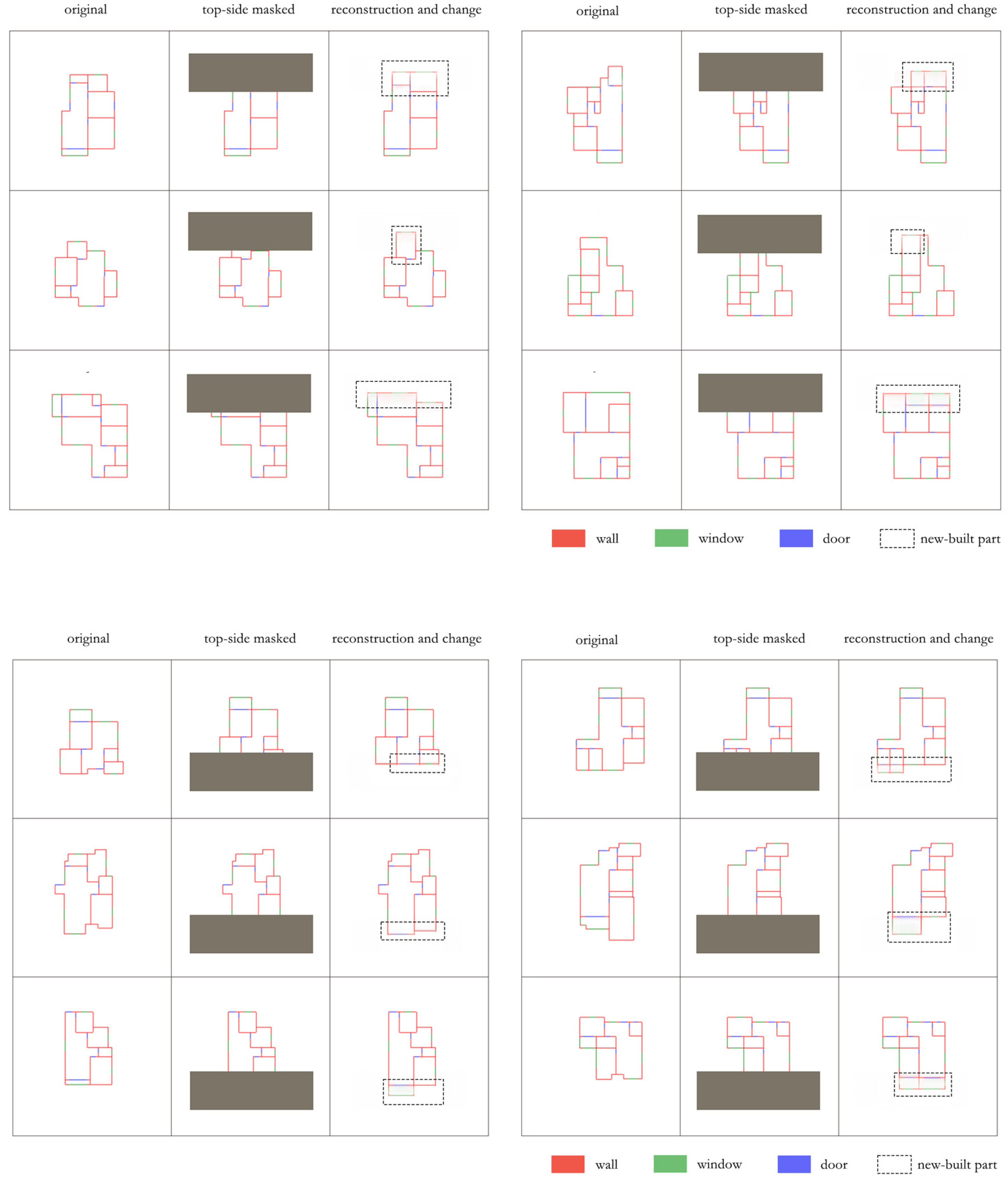 - Spotted-corner Masking (80% masked): Figure 14 illustrates an input where most of the floor plan is obscured, leaving only a fragmented corner region partially visible. Unlike standard corner masking, where a single continuous corner is revealed, spotted-corner masking introduces discontinuous patches in the top-left corner area. This makes the reconstruction task even more challenging, as FP-MAE must infer the overall layout from scattered local clues rather than a single coherent boundary. In the outputs, the model extends the incomplete fragments into a full residential layout. For instance, if a visible fragment suggests part of a balcony or corridor, FP-MAE extrapolates plausible adjacent spaces, adding living areas or bedrooms in reasonable positions. However, due to the high masking ratio (80% of the plan missing) and the fragmented nature of the input, the reconstructions often appear blurred or simplified. Windows and doors may be roughly placed or omitted, and some walls show reduced contrast or slight misalignment. Nevertheless, FP-MAE consistently produces structured and coherent layouts rather than chaotic lines. Even with such limited and discontinuous input, the model leverages strong architectural priors to fill in plausible spaces, demonstrating its robustness in handling highly sparse and irregular masking scenarios.