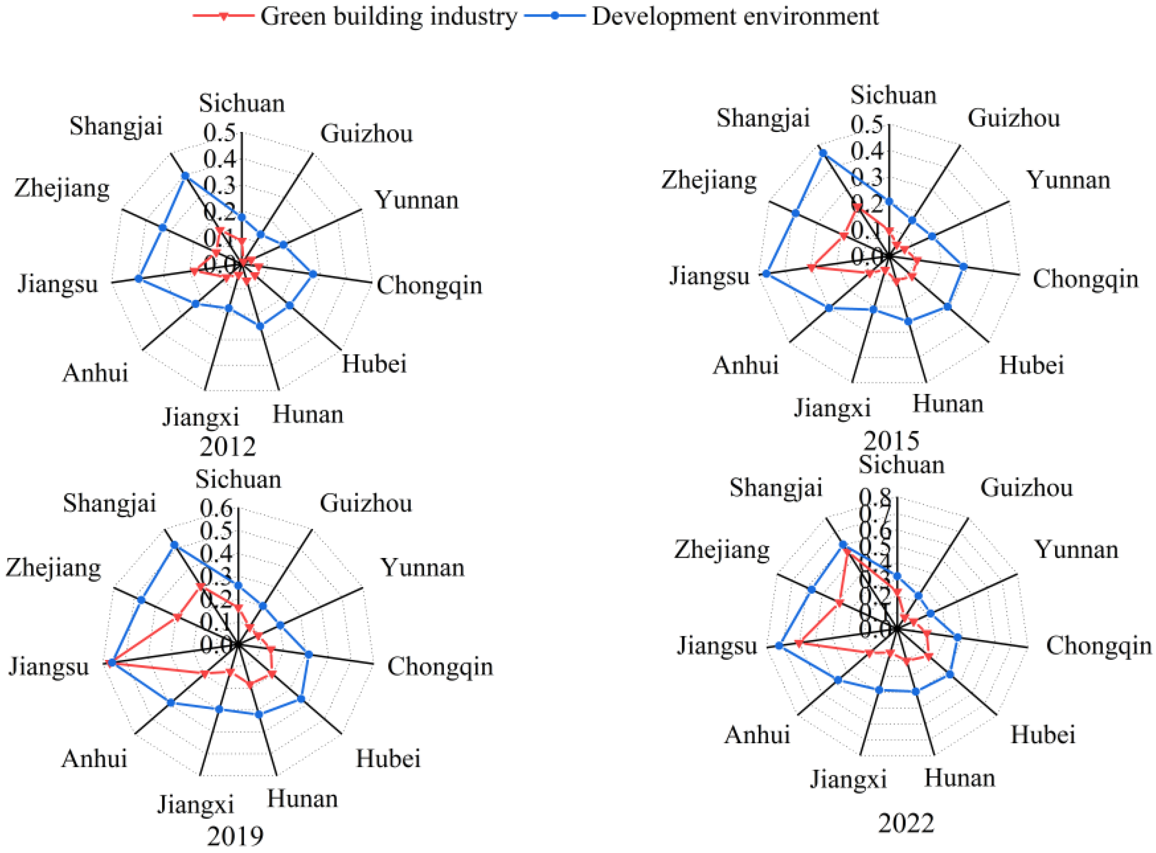 4.1. Evaluation Results of Green Building Industry and Development Environment Levels