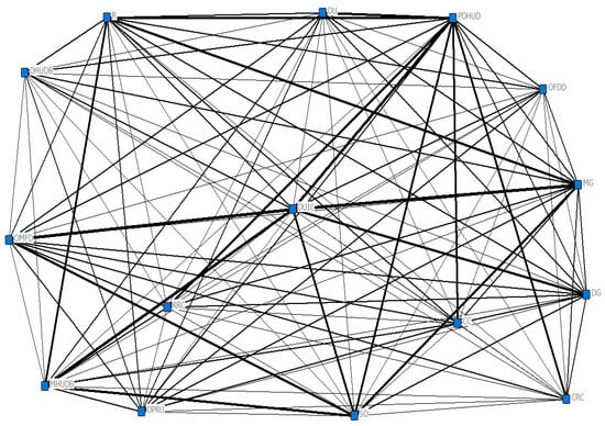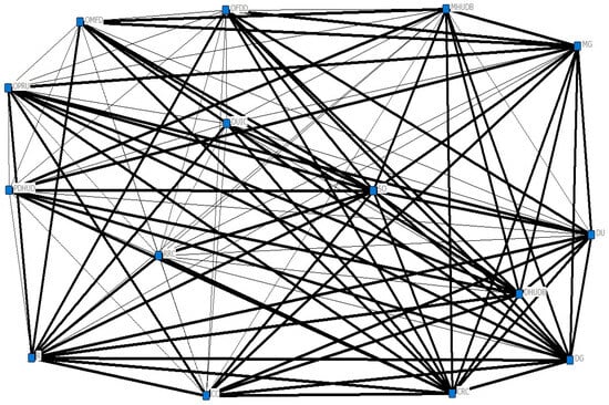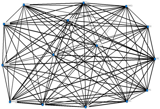 Before conducting network density analysis, the four relationship matrices to be analyzed must first undergo binarization. The binarization method selected in this paper involves calculating the mean value for each row of data and assigning values of 0 or 1 based on whether the row’s values are greater than or less than the mean. The analysis results are presented in Table 4.
