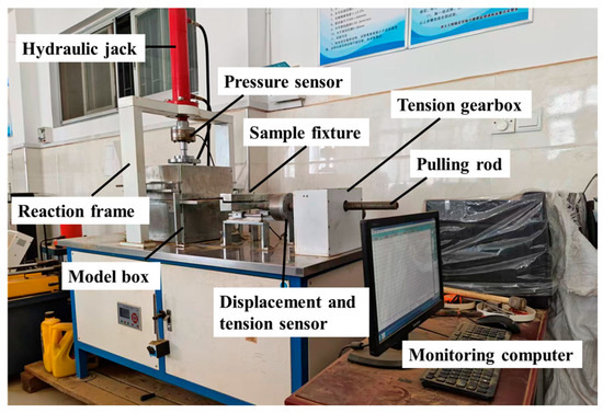 The test employed a self-developed pull-out testing apparatus, as shown in Figure 1. The pull-out device primarily consists of four components: the model box, the lateral loading device, the vertical loading device, and the data monitoring system. The model box measures 40 cm × 35 cm × 40 cm, with its four sides made of steel plates of 1.5 cm thickness. It is divided into two loading chambers (upper and lower), with heights of 15 cm and 25 cm, respectively. The vertical loading device incorporates a hydraulic jack, a gantry frame, and a pressure sensor, while the horizontal loading device comprises a motor, a threaded rod, a clamping fixture, and displacement/tensile force sensors. Test data from mechanical parameter sensors is transmitted to the computer via data cables and monitored in numerical software.