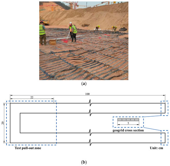 Geogrid configuration and dimensions: (a) geogrid construction and laying; (b) loading and overall dimensions of geogrid in pull-out test.