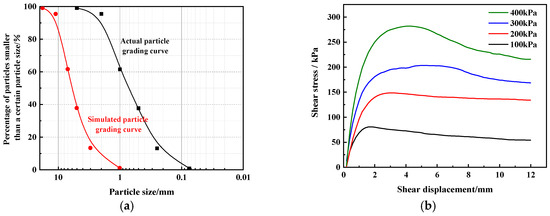 Physical and mechanical properties of filling soil: (a) gradation curve; (b) direct shear curve.