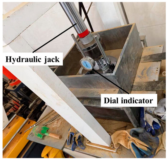 This pull-out test varied parameters including moisture content, pull-out rate, and normal stress. Experimental studies investigated the interfacial pull-out characteristics of geogrids under various operating conditions. By removing transverse ribs and conducting dual longitudinal rib pull-out tests, the contribution of transverse and longitudinal ribs to the pull-out force during the process was determined. Specific test conditions are detailed in Table 3. The pull-out test was carried out under undrained conditions. To ensure full soil consolidation and attainment of the target compaction degree, a dial indicator was used to measure the displacement of the model top cover, as shown in Figure 4. Consolidation of the filled soil was considered achieved if the variation in the dial indicator reading was less than 5% within a 15 min period.