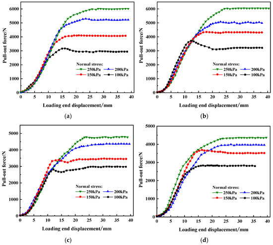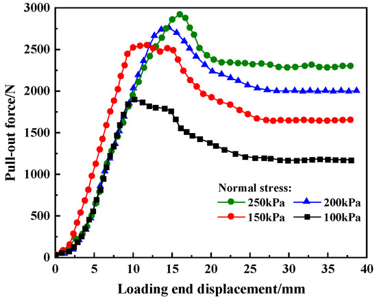 Figure 5 shows the relationship curves between pull-out force and loading end displacement under different drawing rates. It can be seen from the figure that at the same pull-out rate, the peak pull-out force increases with the rise in normal stress, and the growth amplitude is relatively uniform. The pull-out force exhibits a nonlinear increase with the growth of displacement, and its development pattern can be roughly divided into the following three stages: (1) during the initial pull-out stage, the force increases slowly with the displacement, but the rate of increase gradually accelerates; (2) when displacement reaches 5 mm, the pull-out force increases linearly and reaches a peak the location of the peak shifts backward as normal stress increases; and (3) after reaching the peak value, the curve gradually stabilizes, and the pull-out force remains constant as displacement increases. The relationship curves under partial low normal stress conditions exhibit strain-softening behavior, with the force showing a distinct descending segment after peaking.