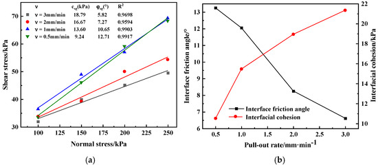 Linear fitting was performed on the shear stress and normal stress at the soil–reinforcement interface under different pullout rates, and the fitting results are shown in Figure 6a. The fitting coefficient R2 is close to 1, indicating a good fitting effect. The reinforcement–soil interface parameters and were calculated from the fitted straight lines, and their variation with the pull-out rate is shown in Figure 6b. The interface friction angle decreases nonlinearly with the increase in pull-out rate, whereas the interface cohesion exhibits the opposite trend. When comparing the interface strength parameters at two pull-out rates of 0.5 mm/min and 3 mm/min, we can find that with the increase in pull-out rate, decreases from 12.71° to 5.82°, representing a reduction of 54.2%. Meanwhile, increases from 9.24 kPa to 18.79 kPa, with a growth rate of 103.4%. It is evident that the pull-out rate exerts a significant influence on the interface strength parameters.