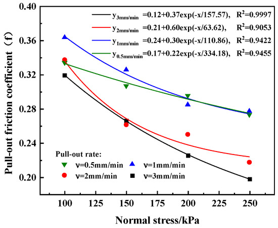 Figure 7 shows the relationship curves between the pull-out friction coefficient f and the normal stress under various pull-out rates, and exponential functions are adopted for curve fitting. In general, the pull-out friction coefficient f decreases nonlinearly with the increase in normal stress. When the normal stress reaches a certain threshold value, the decreasing rate of f tends to slow down. At low pull-out rates of 0.5 mm/min and 1 mm/min, is relatively high. In contrast, at high pull-out rates of 2 mm/min and 3 mm/min, it decreases significantly with a relatively large declining rate. This indicates that an excessively high pull-out rate can considerably weaken the strength of the soil–reinforcement interface.