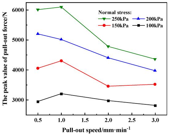 Figure 8 shows the variation curves of the peak geogrid pull-out force with pull-out rate under different normal stresses. It can be seen from the figure that the peak pull-out force exhibits a variation trend of first increasing and then decreasing with the increase in pull-out rate. Furthermore, with the increase in pull-out rate, there exists a critical pull-out rate of 1 mm/min, at which the peak pull-out force of the geogrid reaches the maximum value. This indicates that an appropriate pull-out rate enables the soil surrounding the geogrid to rearrange in a timely manner, which can better improve the mechanical interlocking effect between the geogrid surface and soil particles and enhance the frictional force of the soil–reinforcement interface.