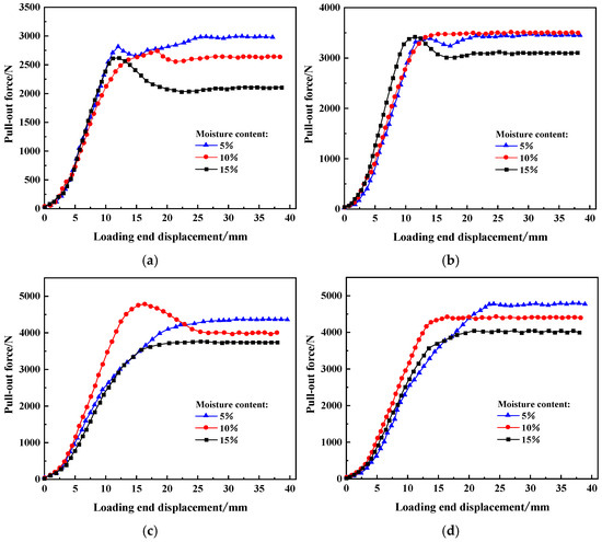 Effects of moisture content on pull-out force under various normal stresses: (a) 100 kPa; (b) 150 kPa; (c) 200 kPa; (d) 250 kPa.