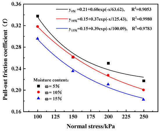 Relationship between pull-out friction coefficient and normal stress under different moisture contents.