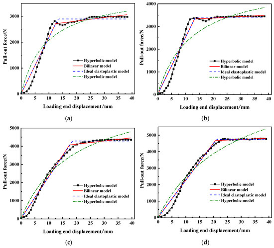 Relationship curves of pull-out force and loading end displacement under different pull-out rates: (a) v = 0.5 mm/min; (b) v = 1.0 mm/min; (c) v = 2.0 mm/min; (d) v = 3.0 mm/min.
