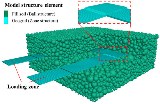 Pull-out tests are usually numerically simulated by means of the Discrete Element Method (DEM), where ball elements are adopted to simulate both the fill and the geogrid, with parameter calibration conducted for the pull-out process. However, considering that the geogrid employed in this pull-out test features relatively wide transverse and longitudinal ribs, simply modeling the geogrid with ball elements cannot adequately simulate the continuity of the soil–reinforcement interface. Therefore, the Finite Difference Method (FDM) was adopted to simulate the geogrid.