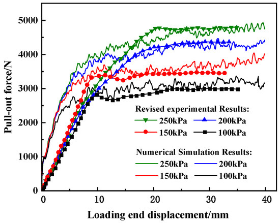 A constant velocity of 2 mm/min was applied to the end elements of the geogrid to simulate the pull-out process, and the stress and displacement at the front end of the pull-out zone were monitored. The model parameters were calibrated based on the measured data of physical tests, with the calibrated parameters and corresponding results presented in Table 5 and Figure 14. As shown in the figure, to eliminate errors caused by test equipment and operations, the stress–hardening segment in the early stage of the pull-out displacement curve was corrected. The numerical simulation results are well in agreement with the corrected displacement curve.