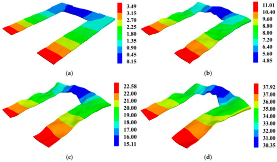 Figure 15 illustrates the displacement characteristics of the geogrid when the loading ends reach 5 mm, 10 mm, 20 mm, and 40 mm. To visualize the deformation of the geogrid itself, the amplification factor Def-fac was set to eight. As shown in the figure, when the loading end displacement is less than 10 mm, the displacement of different parts of the geogrid varies significantly. Then the displacement of each part of the geogrid becomes relatively uniform, and the transverse ribs start to produce considerable movement. In the overall pull-out direction, the displacement of the geogrid transverse ribs exhibits an arc-shaped distribution pattern with smaller values in the middle and larger values at both ends. As the loading end displacement increases, the curvature of the arc becomes more pronounced.