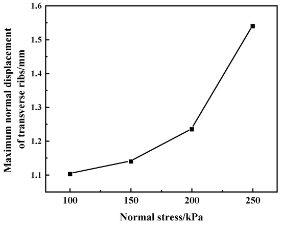 The maximum normal displacement of the grid cross-ribs under various normal stresses is extracted, yielding the variation curve between displacement extremes and normal stress, as shown in Figure 16. The figure reveals that the maximum normal displacement of the grid cross-ribs exhibits nonlinear growth with increasing normal stress. When the normal stress exceeds 200 kPa, the displacement extremum rises rapidly, indicating that the grid cross ribs become further embedded into the soil particles.