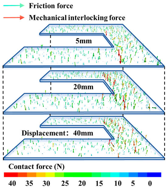 The force vector nephograms of the wall–ball contact elements were extracted when the displacement at the loading end reached 5 mm, 20 mm, and 40 mm, and the stress state of the soil–reinforcement interface was analyzed, as shown in Figure 17. As shown in the figure, the friction force represented by the blue–green arrows is relatively uniformly distributed across all parts of the geogrid. As the pull-out displacement increases, there is little significant change in the size and distribution of the arrows, indicating that the friction force at the soil–reinforcement interface remains relatively stable during the pull-out process. The contact force indicated by the red arrows has a relatively large magnitude, which represents the mechanical interlocking force generated by the extrusion between soil particles and the geogrid. It can be observed that during the early and middle pull-out stages, the mechanical interlocking force originates predominantly from the front ends of the geogrid transverse ribs and the protrusions at transverse-longitudinal rib junctions. Combined with the content in Section 4.3.1, in the later stage of pull-out, the transverse ribs undergo significant deformation, leading to a relatively backward distribution of mechanical interlocking force, which is roughly concentrated in the middle of the transverse ribs. This indicates that the magnitude and acting position of the mechanical interlocking force change dynamically during the pull-out process, which is correlated with the deformation of the geogrid itself.