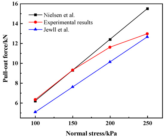 Pull-out resistance of theoretical and experimental results under different normal stresses.