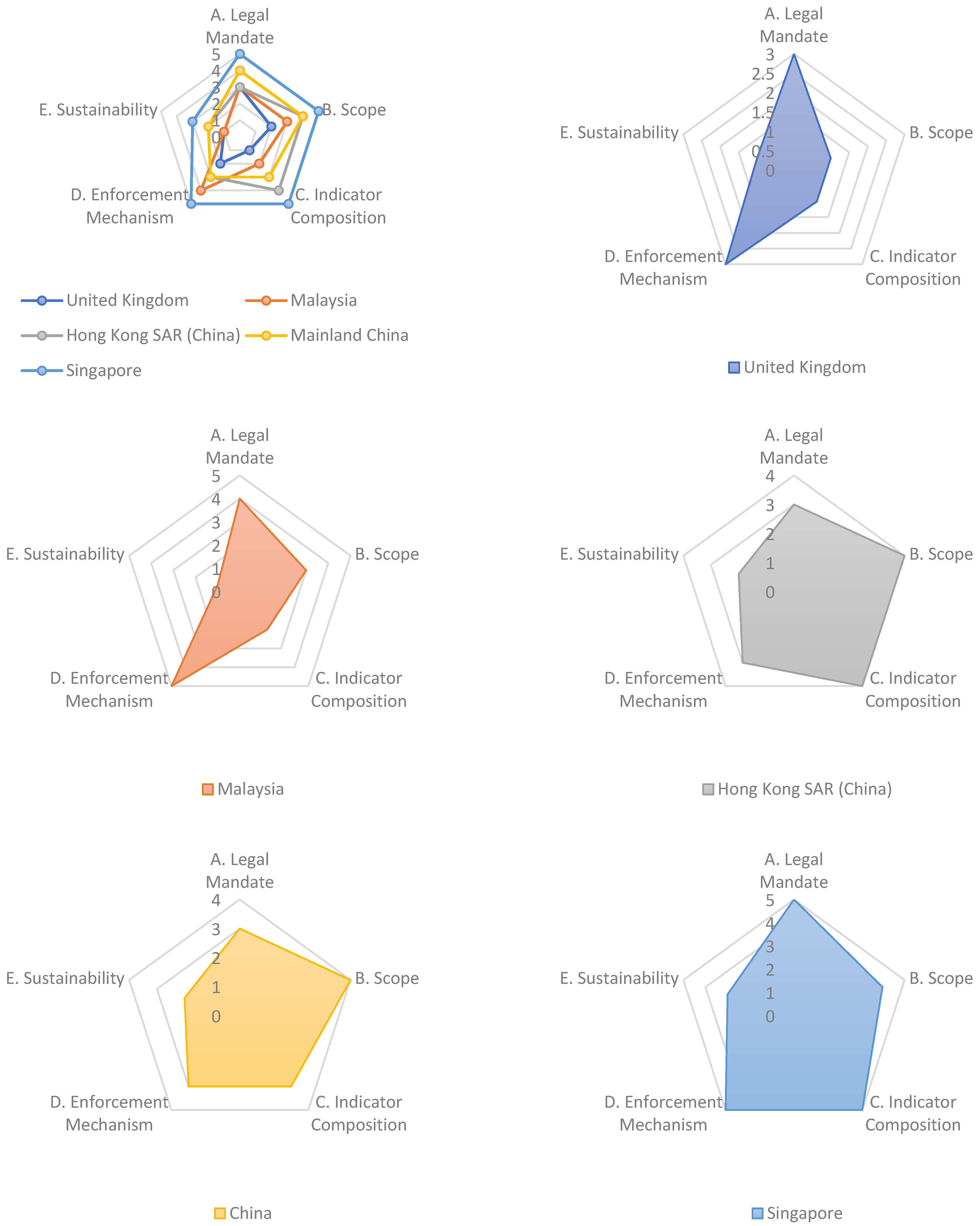 | Region (Index Name) | A. Legal Mandate | B. Scope | C. Indicator Composition | D. Enforcement Mechanism | E. Sustainability | Total Score |