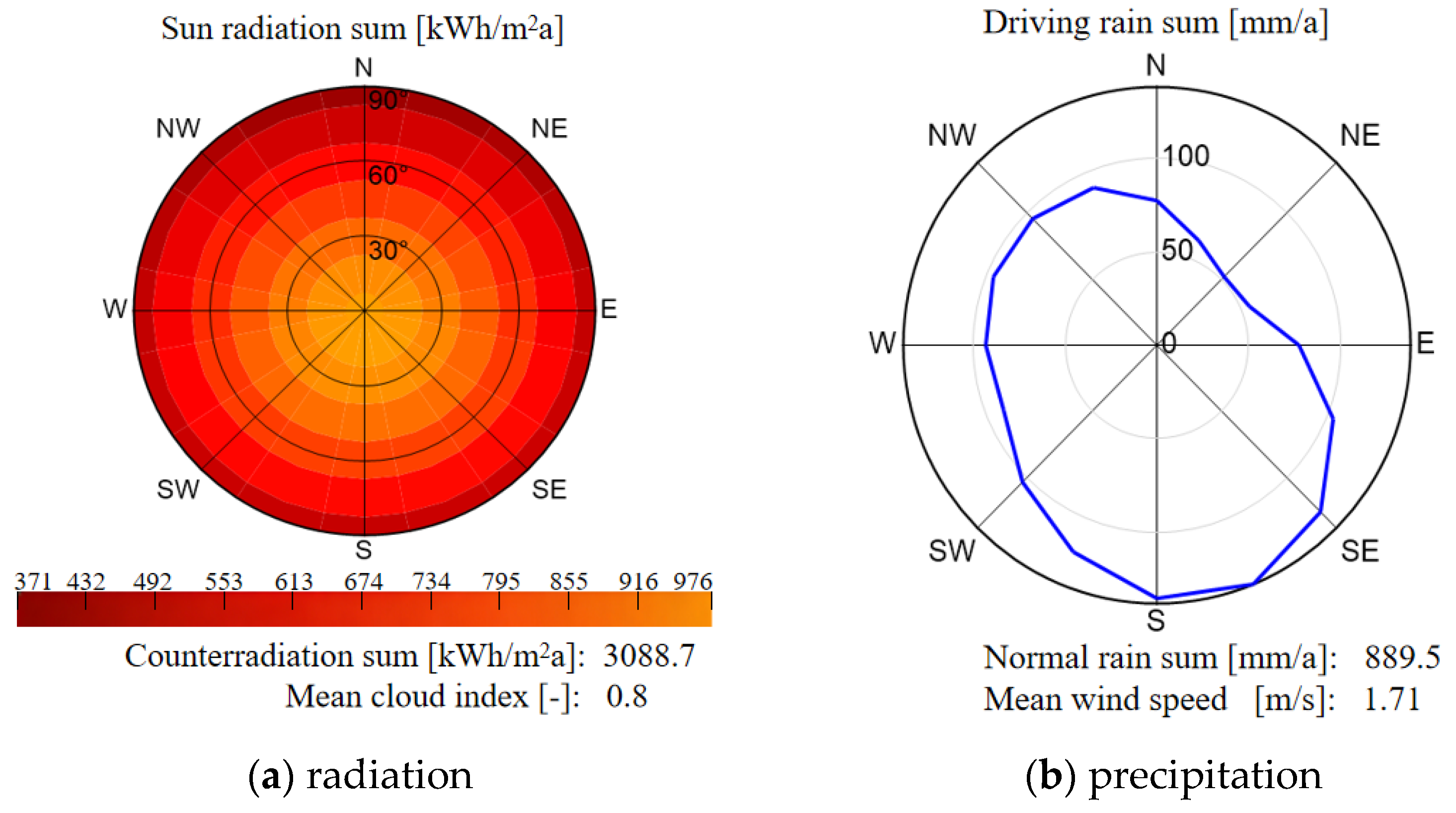 - Libralato, M.; De Angelis, A.; Tornello, G.; Saro, O.; D’Agaro, P.; Cortella, G. Evaluation of Multiyear Weather Data Effects on Hygrothermal Building Energy Simulations Using WUFI Plus. Energies 2021, 14, 7157. [Google Scholar] [CrossRef]