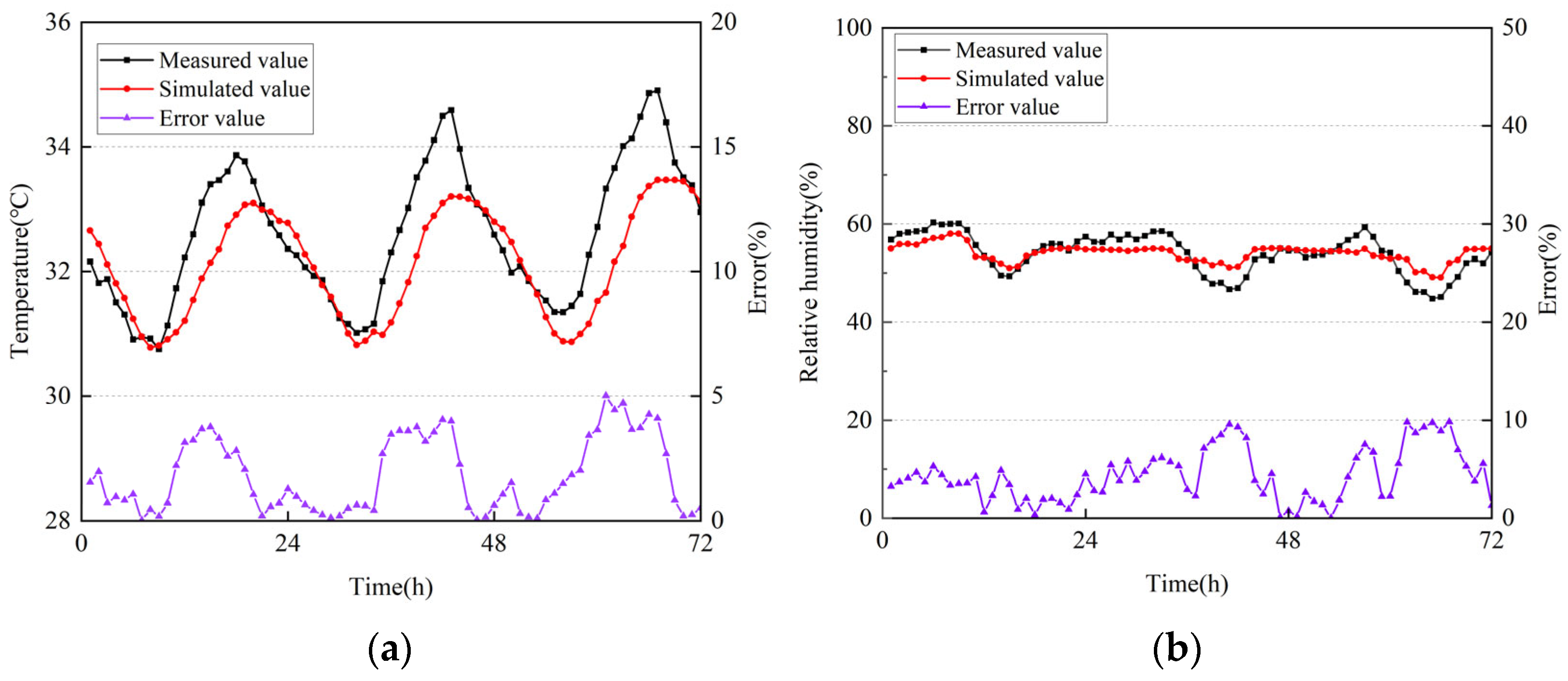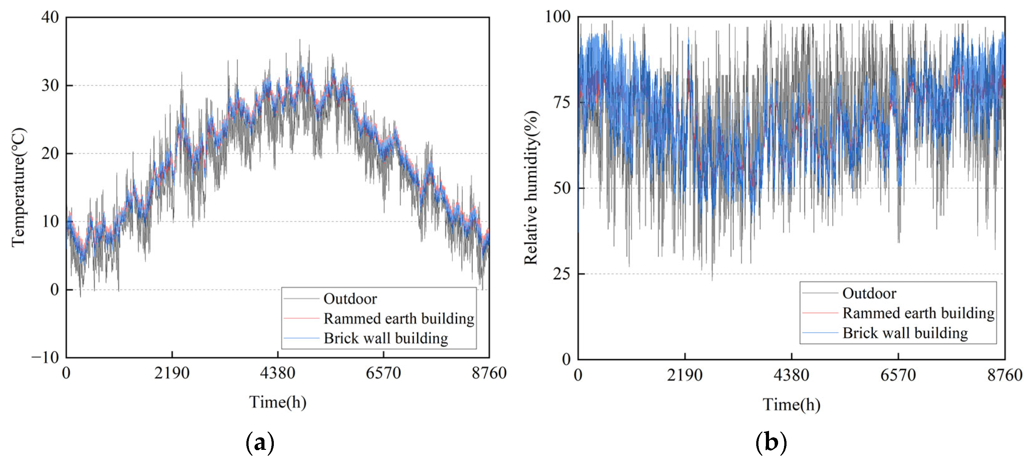 - Under indoor personnel load conditions without air conditioning, rammed earth buildings exhibited superior hygrothermal performance compared with brick buildings. Specifically, the minimum and maximum indoor temperatures were 0.7 °C higher and 0.4 °C lower, respectively, in rammed earth buildings. The annual average indoor temperature reached 19.3 °C, slightly exceeding that of brick buildings. In terms of humidity, the rammed earth buildings demonstrated an 11.4% higher minimum and 9.6% lower maximum indoor relative humidity, with an annual average of 69.2%, which is marginally lower than that in brick buildings. The dynamic simulation results confirmed that rammed earth buildings maintained a more stable indoor hygrothermal environment. Overall, the warmer and drier indoor conditions provided by rammed earth contributed to improved thermal comfort throughout the year.