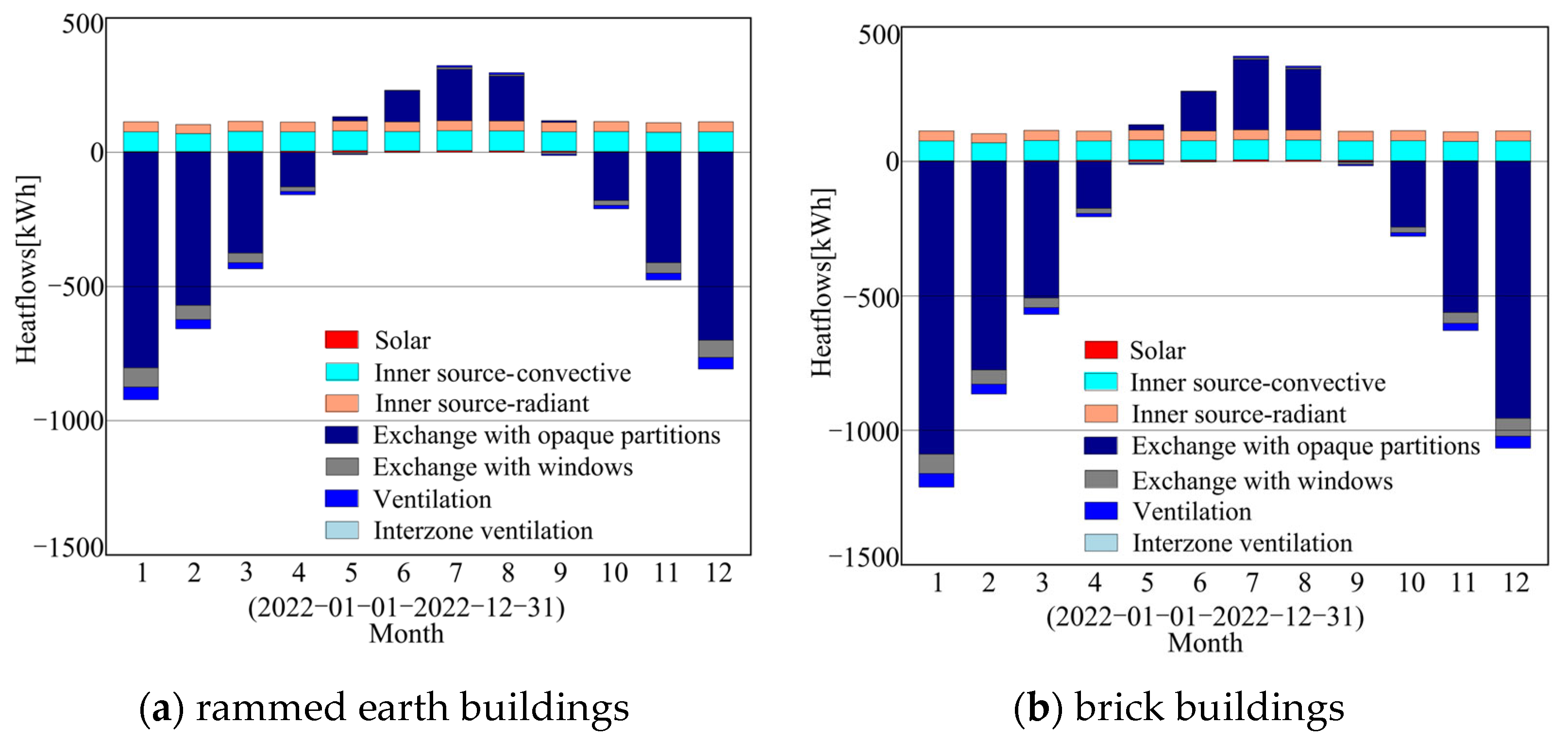 - With HVAC systems implemented, the annual energy consumption for heating and cooling in brick buildings was 1.37 and 1.20 times higher, respectively, than that of rammed earth buildings under identical indoor temperature and humidity settings. Moreover, the monthly dehumidification demand in brick buildings exceeded that in rammed earth buildings throughout the year. These results highlight the ability of rammed earth buildings to maintain comfortable indoor hygrothermal conditions with lower energy input, demonstrating their superior energy-saving performance.