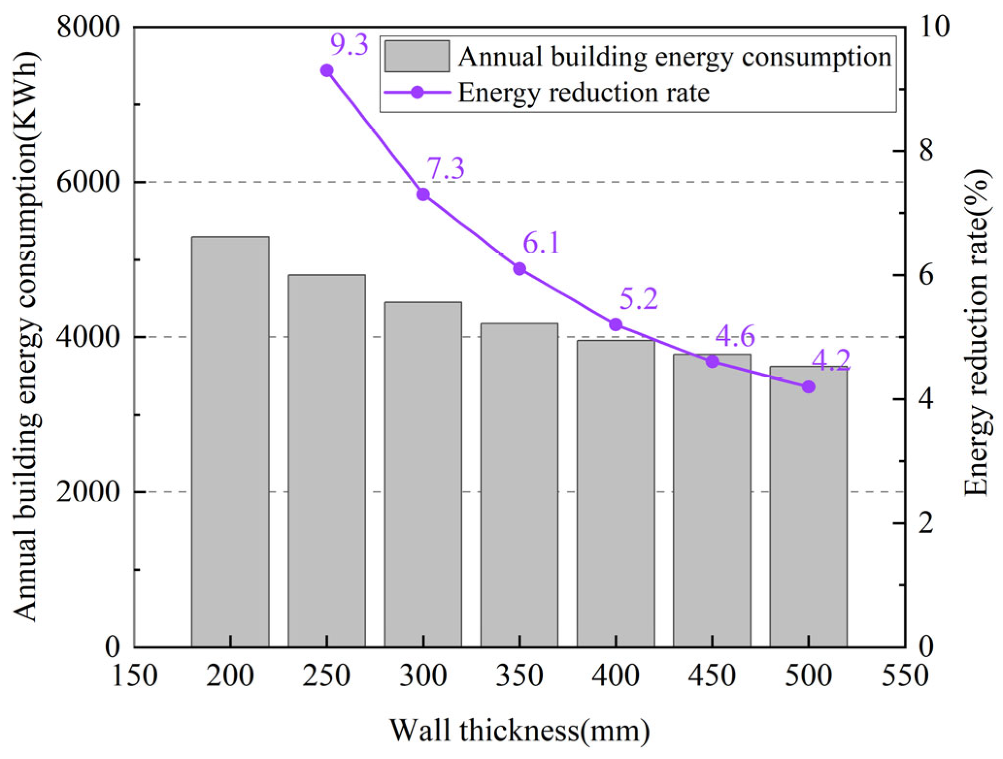 - As the wall thickness increased, the energy consumption reduction rate of rammed earth buildings gradually declined, falling below 5% when the thickness exceeded 400 mm. Therefore, considering energy efficiency, structural safety, and cost-effectiveness, a rammed earth wall thickness of 350–400 mm is recommended.