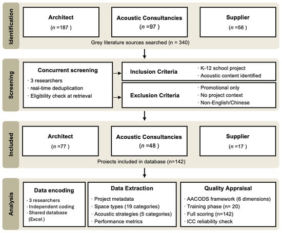 In school acoustic design, grey literature is particularly important because substantial practice knowledge exists as project documentation rather than academic publications. Architectural firms record completed projects through design narratives and visual presentations; acoustic consultants prepare technical reports detailing performance targets and noise control strategies; and material suppliers publish project case studies demonstrating product applications. Grey literature often offers contemporaneity by documenting recent developments and industry dynamics [37]. Together, these sources constitute a body of practice-based evidence, recording what has actually been designed, built, and, in some cases, verified through measurement.