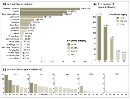 Distribution of space types and acoustic strategies in 142 K–12 school acoustic design projects. (a) Frequency of space types documented across projects. Bars indicate the number of projects containing each space type; percentages show proportion of total projects (n = 142). Space type codes defined in Table 1. (b) Adoption rates of five acoustic strategy categories. Bar height represents the number of space instances employing each strategy category; percentages indicate proportion of total space instances (n = 224). IS = Interior Surface; SP = Spatial Planning; RA = Room Acoustic Elements; EN = Envelope/Partition; SE = Systems and Equipment. (c) Distribution of specific strategies within each category. Sub-panels correspond to the five strategy categories: (IS) Interior Surface, (SP) Spatial Planning, (RA) Room Acoustic Elements, (EN) Envelope/Partition, and (SE) Systems and Equipment. Bar height indicates the number of projects adopting each strategy subcategory. Strategy codes defined in Table 1 and Table A1. A single project may include multiple space types and strategies, resulting in 224 total space instances across 142 projects. Complete definitions provided in Table A3 and Table A4.