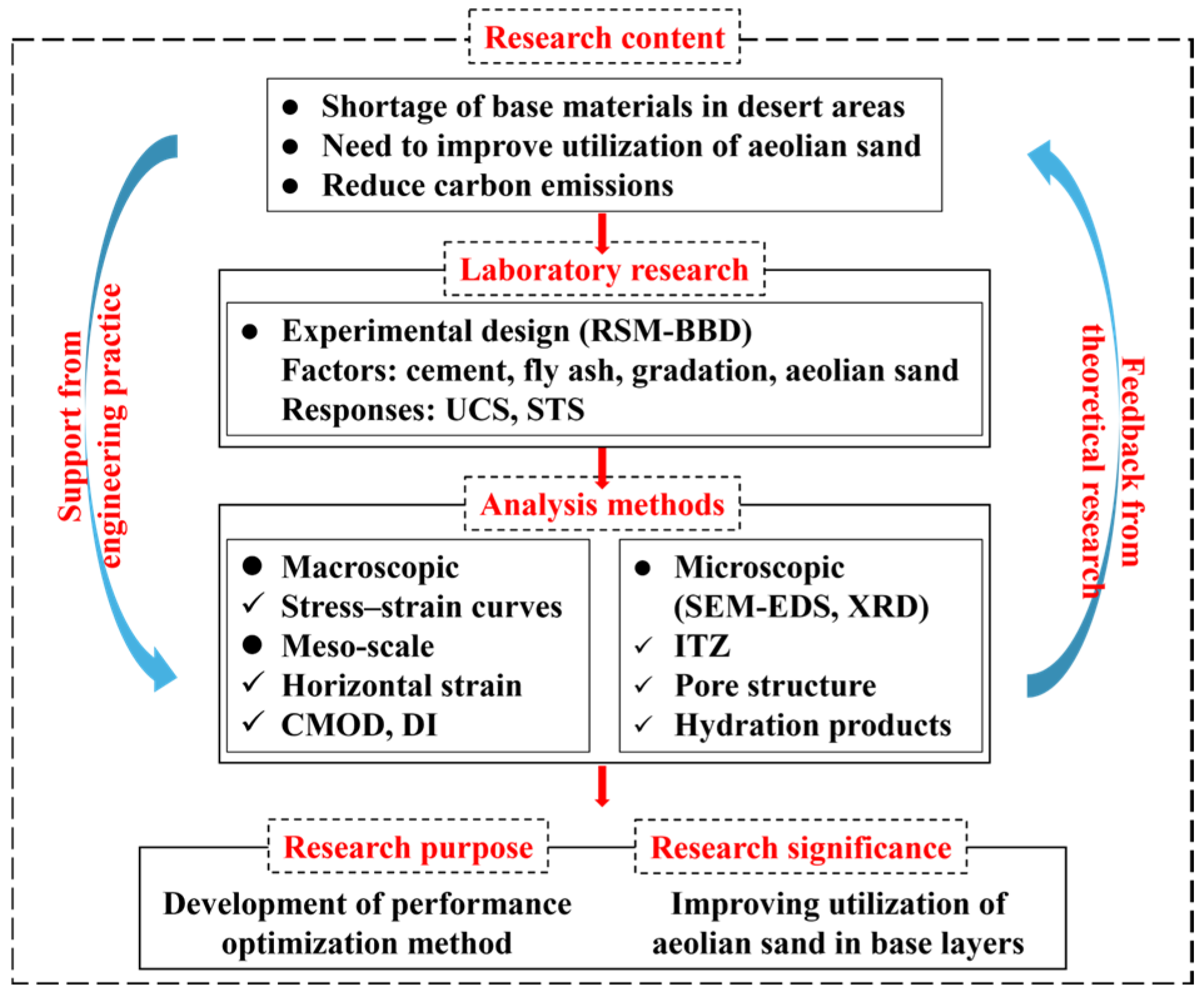 - RSM predicted the 7-d UCS and STS reliably. UCS was dominated by aeolian sand content; STS was mainly controlled by the cement content and cement-to-fly ash ratio. Interactions were non-negligible and supported multi-objective optimization.