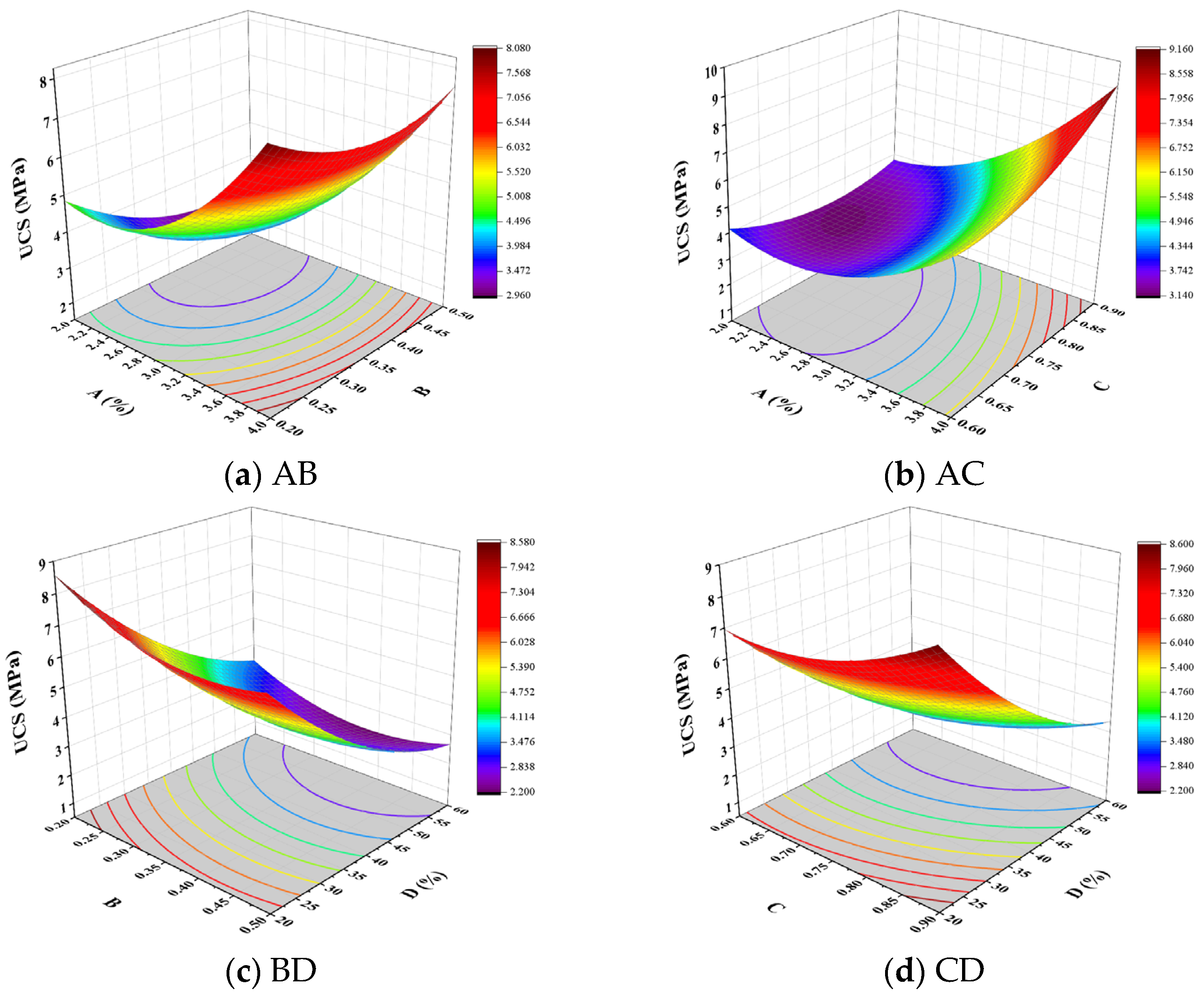 - At fixed optimized binder parameters, a higher aeolian sand content reduced both the 7-d UCS and STS and weakened the stress–strain load-bearing response. Excess aeolian sand thus degrades the binder–aggregate skeleton and hastens failure.